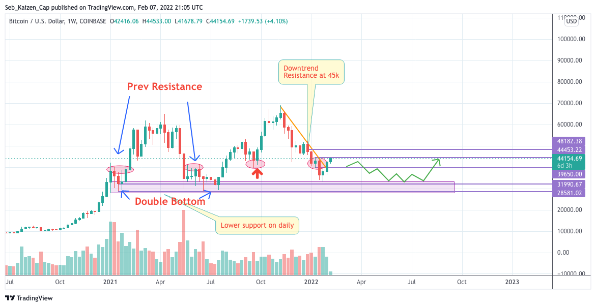 I will expect a clear break of the 45k resistance and a support created in lower time frames for a continuation up to the next resistance. This happening during this week.