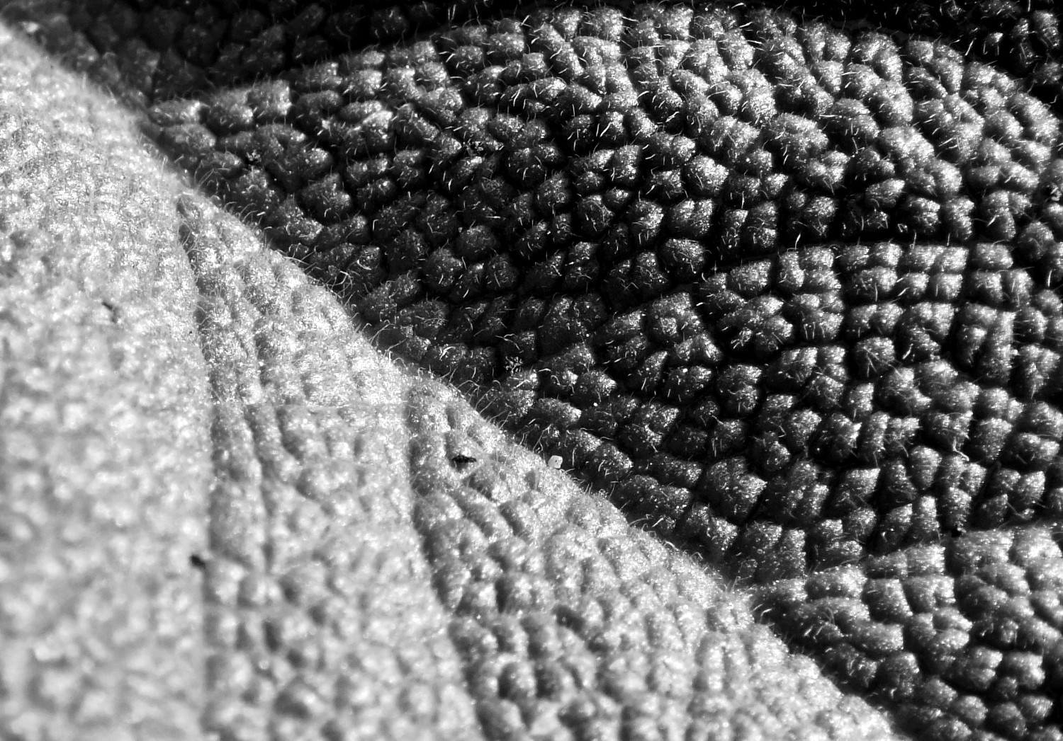Not some strange rolling hillocks in the tundra, but the surface of a sage leaf; extreme close-up