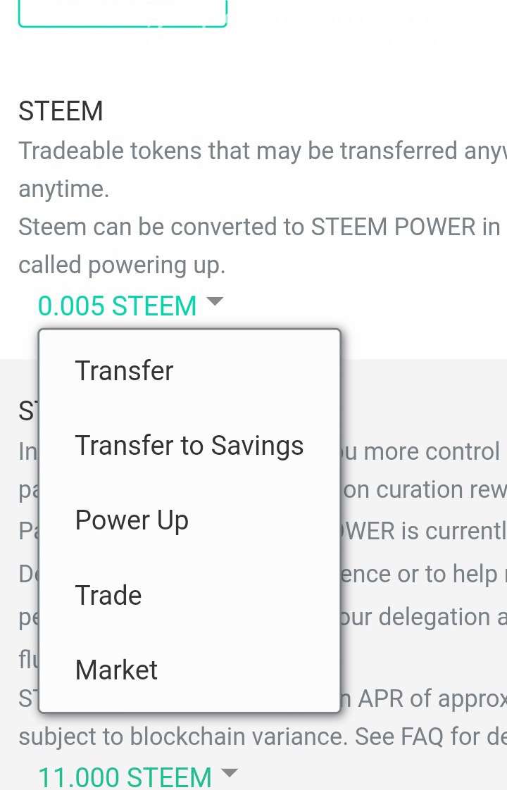 Below is how to do just that. First is to log in to my wallet and go down to the steem column and click the drop- down arrow and choose transfer which is the first option in the box, as you can see below.