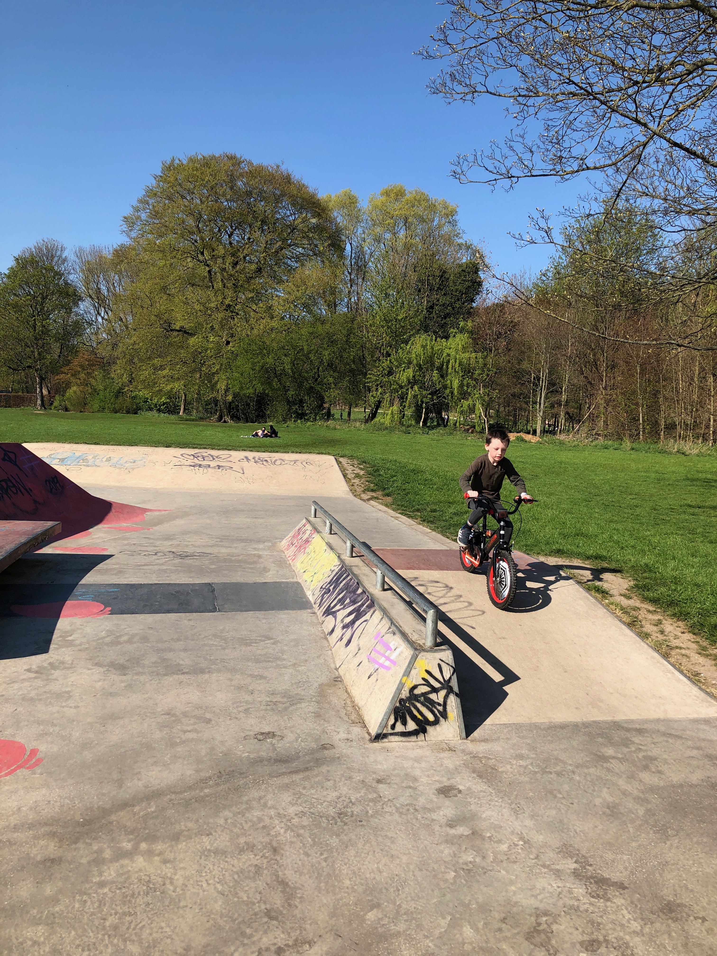 No stunts I am afraid, he just went around the skate park but carefully going up and down the lumps.