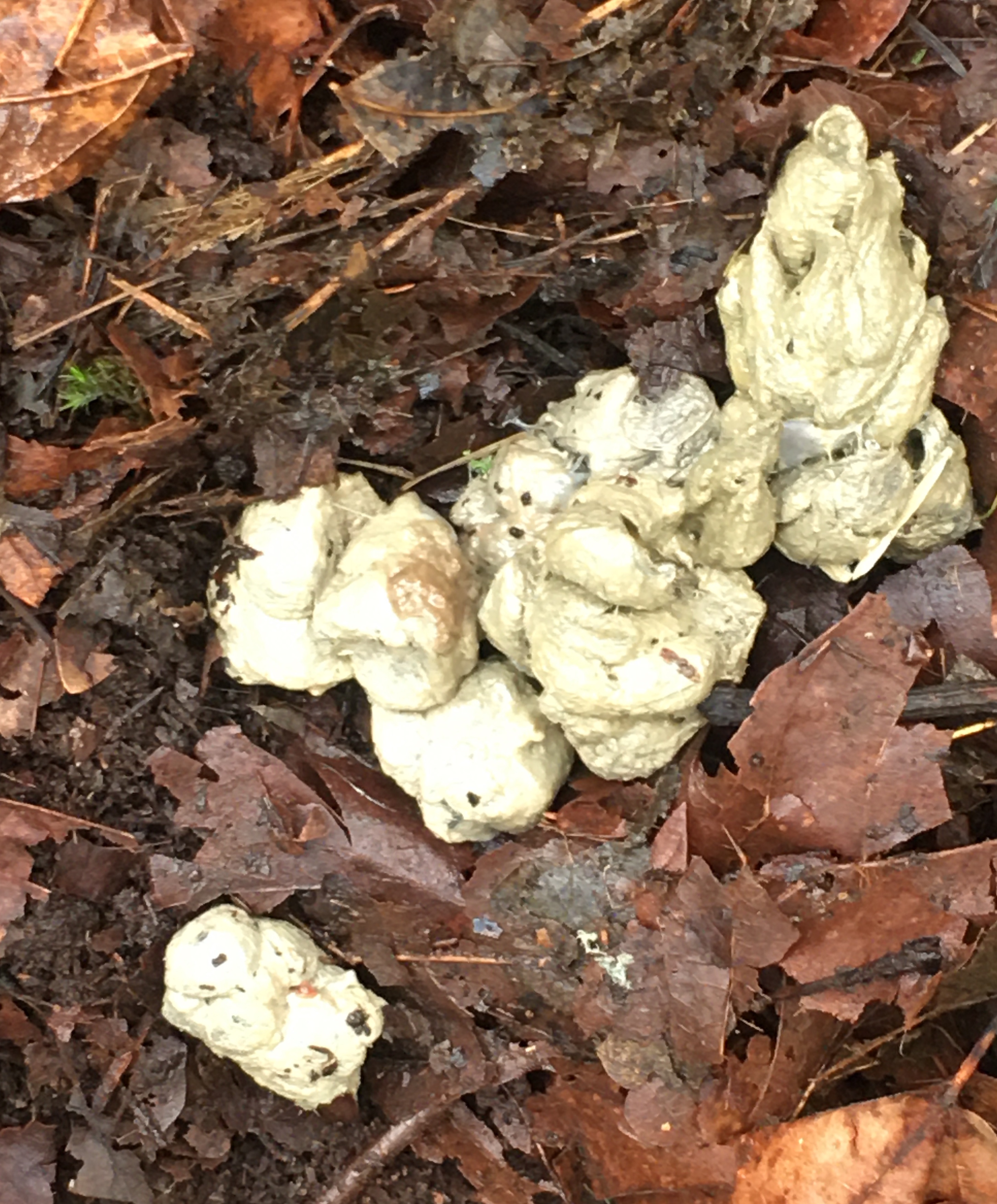 We stumbled upon this scat; interesting color and we're not sure what animal it came from. I'm thinking maybe a bobcat but then I really have to ask just what was it it ate?