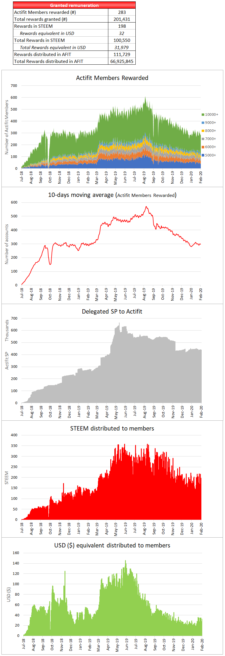 Since the start of the project, Actifit has provided rewards to members posting their reports. In the table below you’ll find the daily and overall granted rewards. The first two charts illustrate the number of rewards sent, the third chart provides the SP delegated to Actifit and the final two charts present the daily and average STEEM/USD distribution to members, curators & beneficiaries.