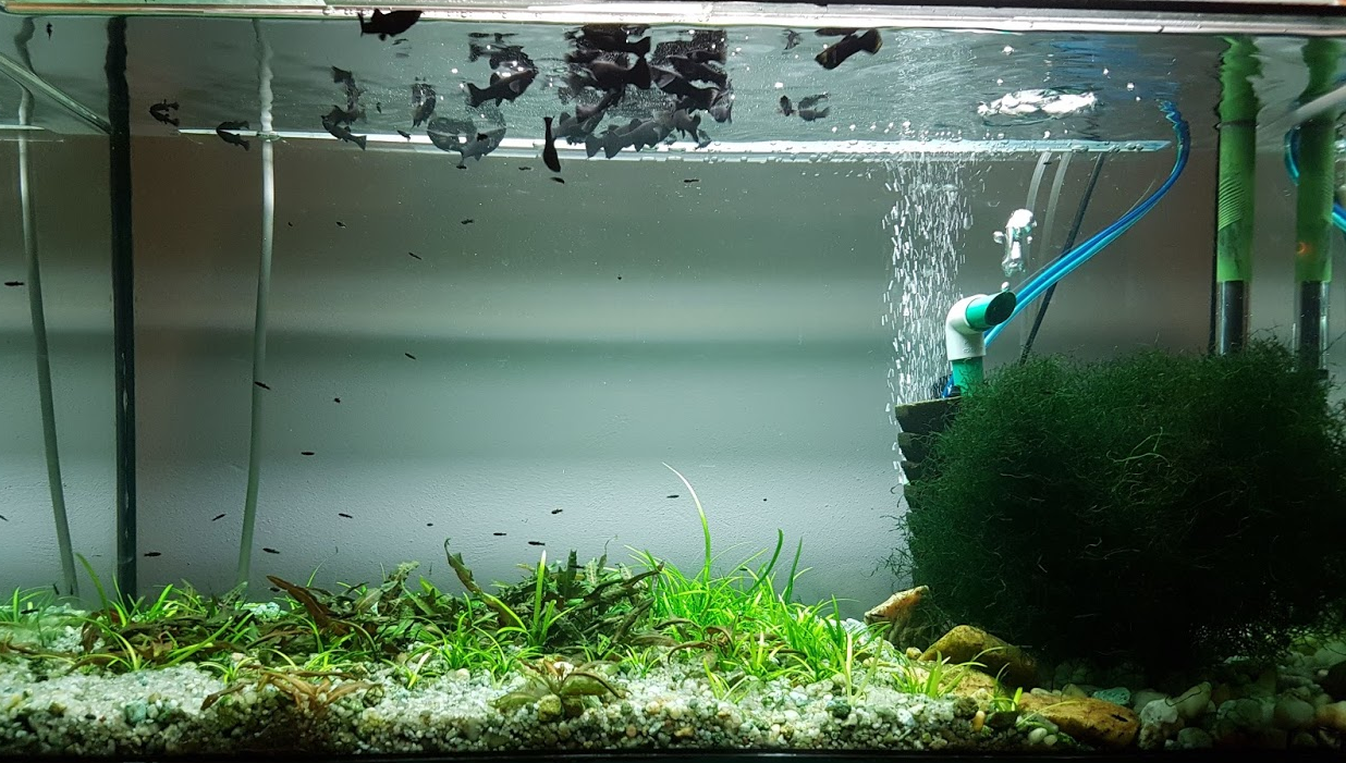 Nedělní část mého dne, jako vždy, patří rybkám. Nyní jsou vyfoceny při krmení. Vidíte podobnost s ekosystémem Steemit? Velké ryby jsou hned u zdroje a ty malé (potěr) čekají co na ně zbude.