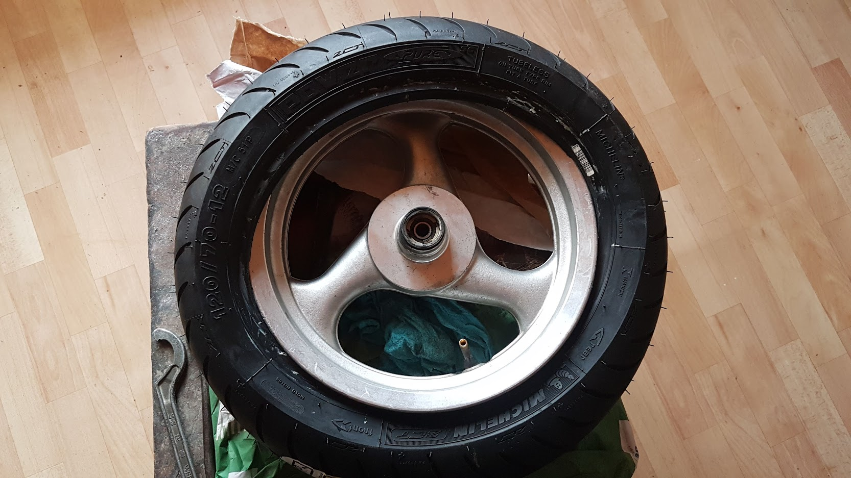 Výměna probíhala pěkně postaru. Ručně s mont pákama. Pokaždé je těžší starou gumu sundat, než novou nandat. Jako pomocníka jsem použil mýdlo a styčné plochy jím namazat. Ne nadarmo se říká: „Klouže jako mejdlo.“