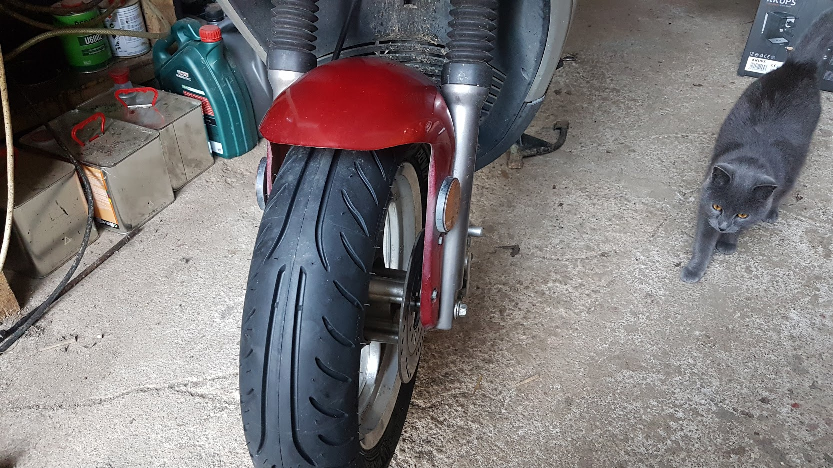 Výběr padl na produkci firmy Michelin. Stejná jako je již na zadním kole. Pořizovací cena byla též příznivá. Za necelých 950 korun českých mám opravdu dobrý pocit nejen na suchu, ale i na mokru. V mezi čase jsem odzkoušel i pneumatiku Mitas ze slovenské produkce. Vzhledem k měkké použité směsi rychle ubývala. Když jsem ji píchl, rozhodl jsem se ji nahradit již zmíněnou Michelinkou.