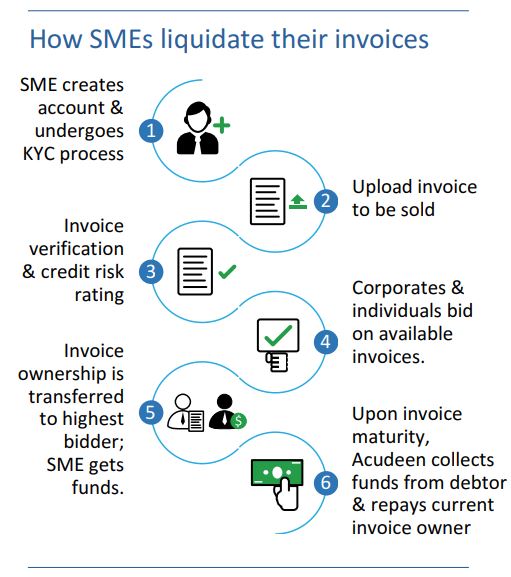 Acudeen is trying to solve this problem by providing liquidity to SMEs as well as micro-businesses. Acudeen is a decentralized inventory and marketplace for movable assets(invoices, vehicles, receipts, etc). It brings together sellers and buyers of movable assets. To know more about it in details, have a look at there whitepaper - https://tokensale.acudeen.io/assets/docs/AssetChain-ACU-whitepaper.pdf
