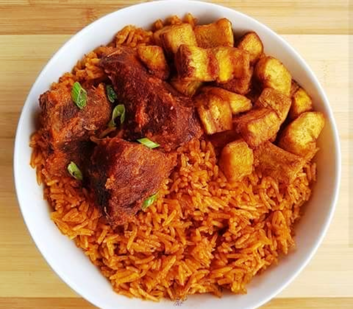 photo of Jollof Rice garnished with fried plantains and Fried Beef (A Nigerian Dish).