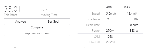 I had 34x36 as my lowest gear and was still grinding at an average cadence of 70 while averaging 270 watts, just to give you an idea how steep it really is.