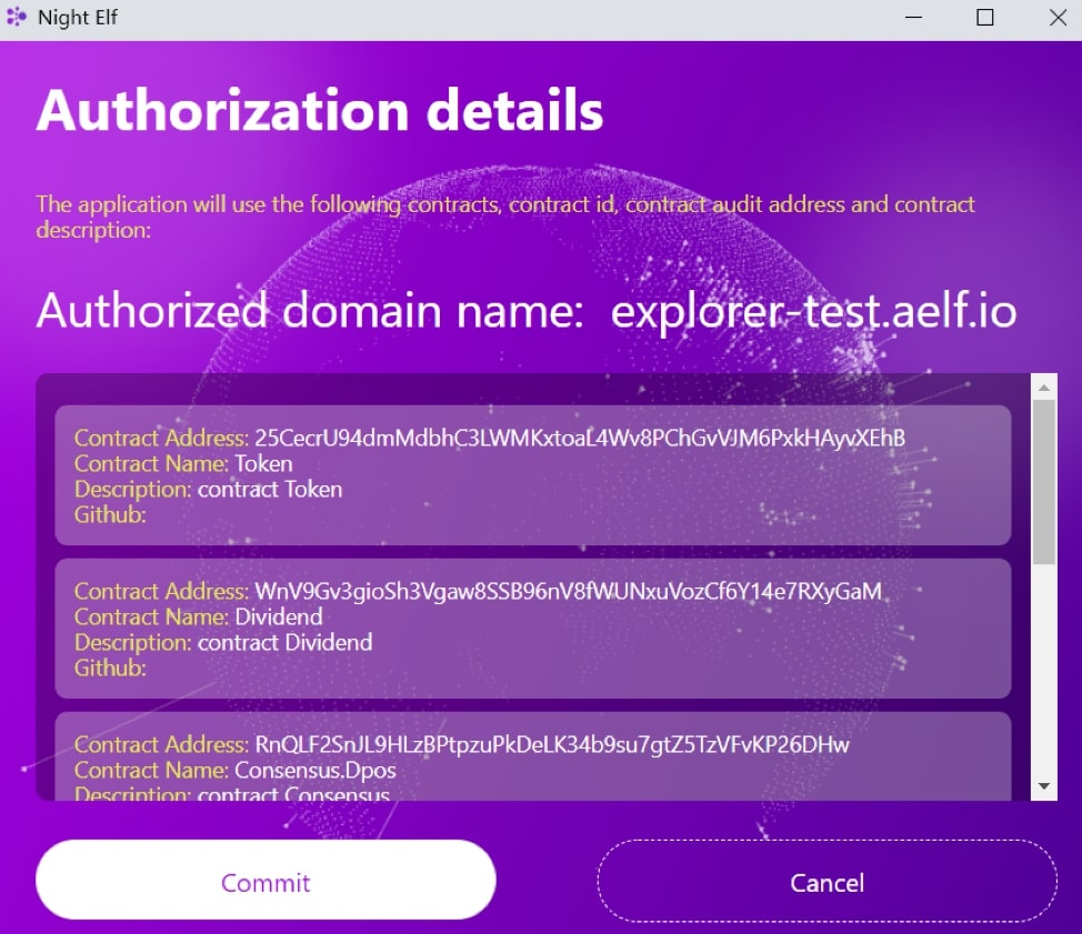 Nhấp vào nút, sau đó, bạn có thể xem chi tiết các ủy quyền mà Dapp hiện tại yêu cầu. Điều này có thể bao gồm tên miền, địa chỉ hợp đồng, tên hợp đồng, mô tả hợp đồng, địa chỉ Github, v.v.Login