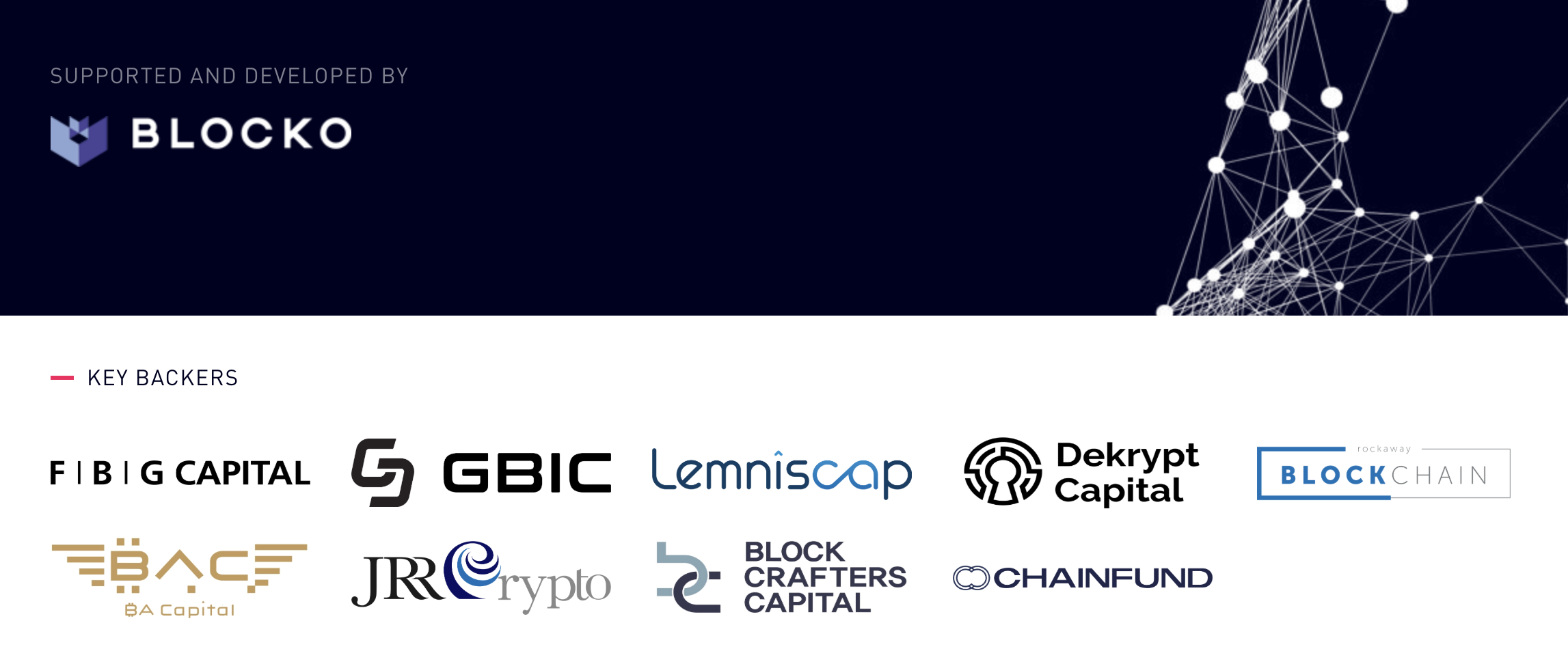 Key backers: FGB Capital, GBIC, Lemniscap, Dekrypt Capital, Rockaway Blockchain, BA Capital, JRR Crypto, Block Crafters Capital, Chainfund Capital.
