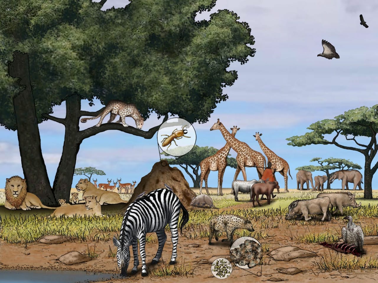 All the dung produced by the animals grazing the savanna contains a lot of half- digested grass. this is recycled by busy dung beetles that roll the dung into balls, burying them for use as food reserves for themselves or their young.