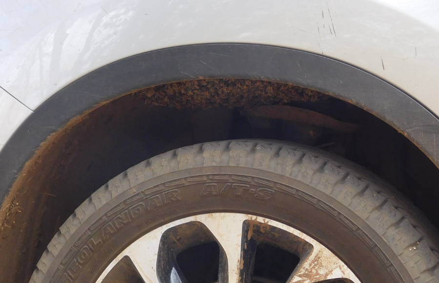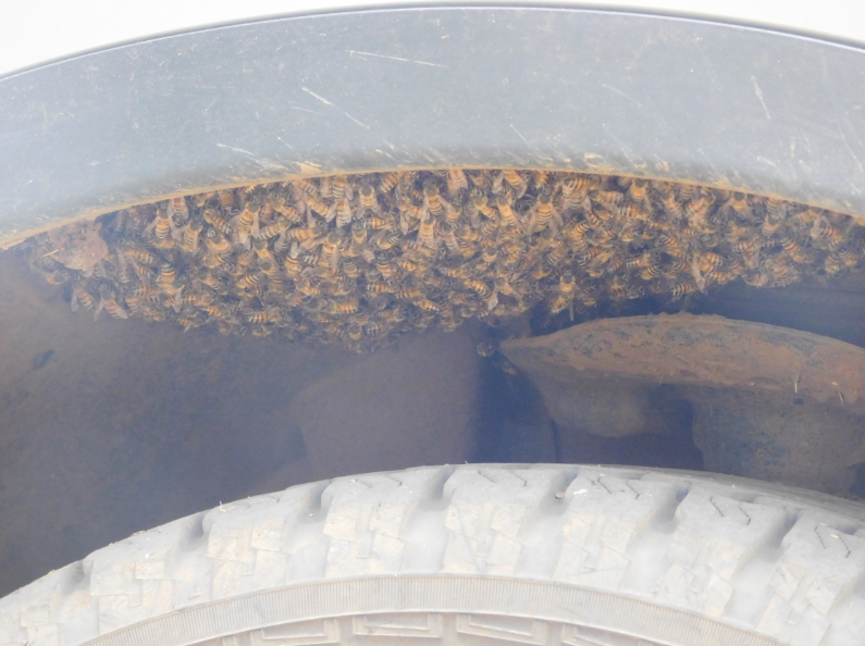 A swarm of bees was hanging on for dear life in the wheel well of my car.