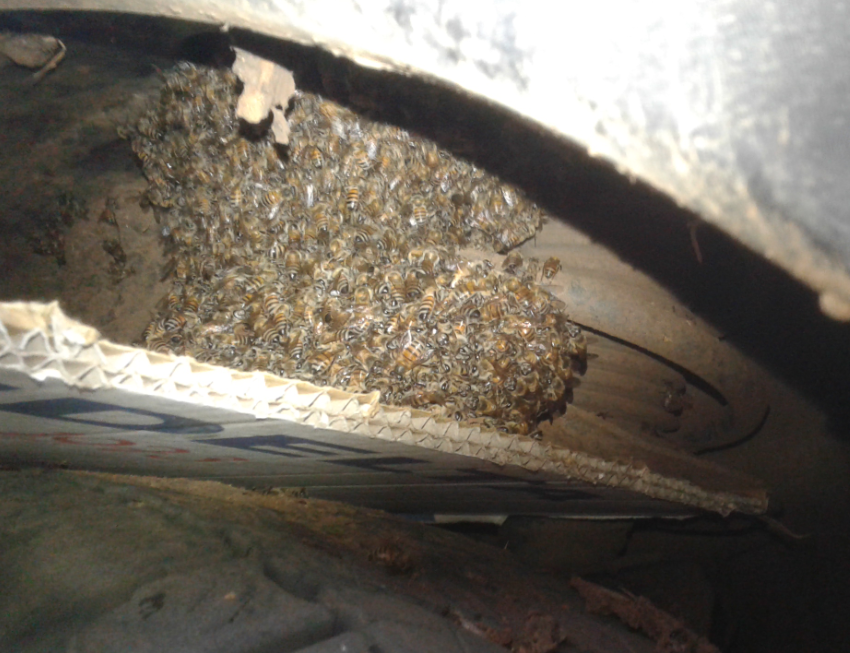 Not having any typical bee protective gear the best bet was to try to move the swam of bees, that I found in my tire well yesterday, in the cold of the morning.