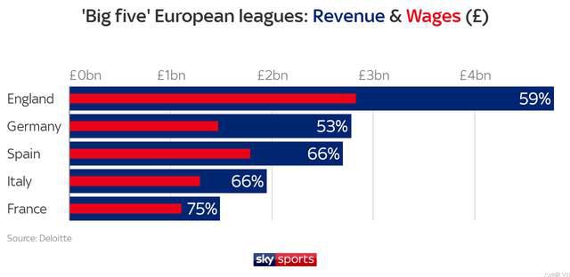 But England's top-flight clubs have shelled out £2.8bn of that revenue in wages - but that 59 per cent ratio is still only bettered by the Bundesliga (53 per cent).