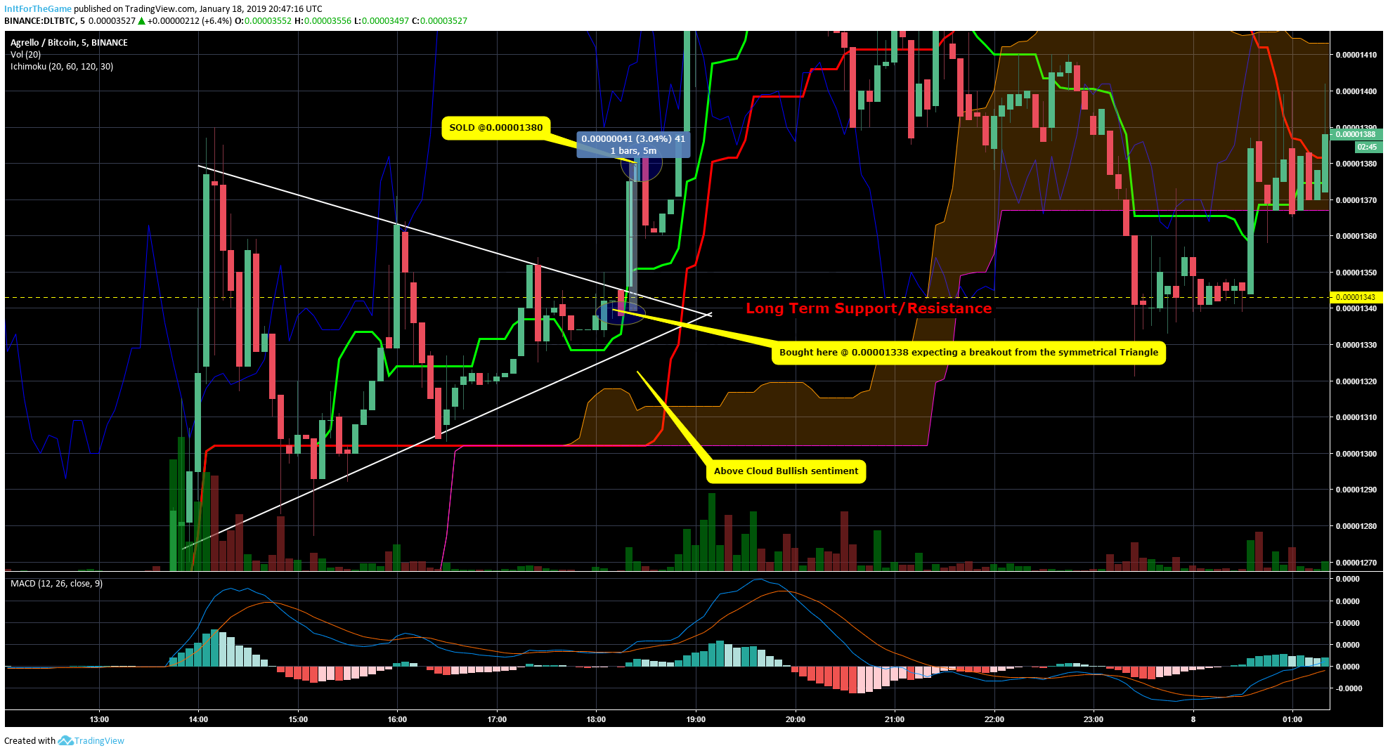 The price was at a long term resistance level which I was expecting to break through as there was a trend continuation pattern and the symmetrical triangle was forming which well known a bullish pattern, the price was painting higher lows above the cloud which means bullish sentiment in the market. Made a 3% gain in 5 minutes.