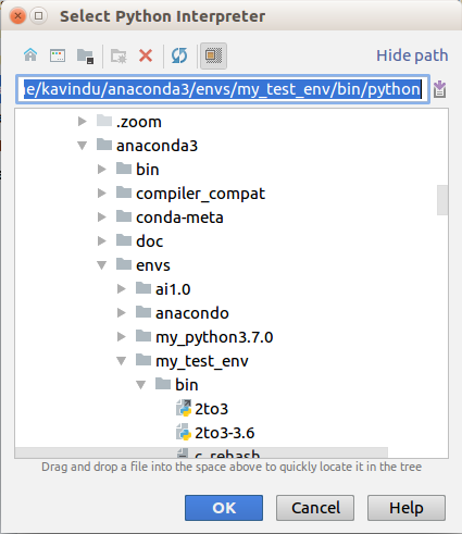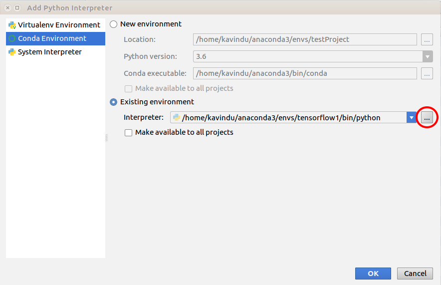 Now click on the icon which has three dots and select the conda environment which is located in /home/user/anaconda3/envs/my_test_env/bin/python. Here my_test_env the test conda environment created by me and you should select your conda environment.