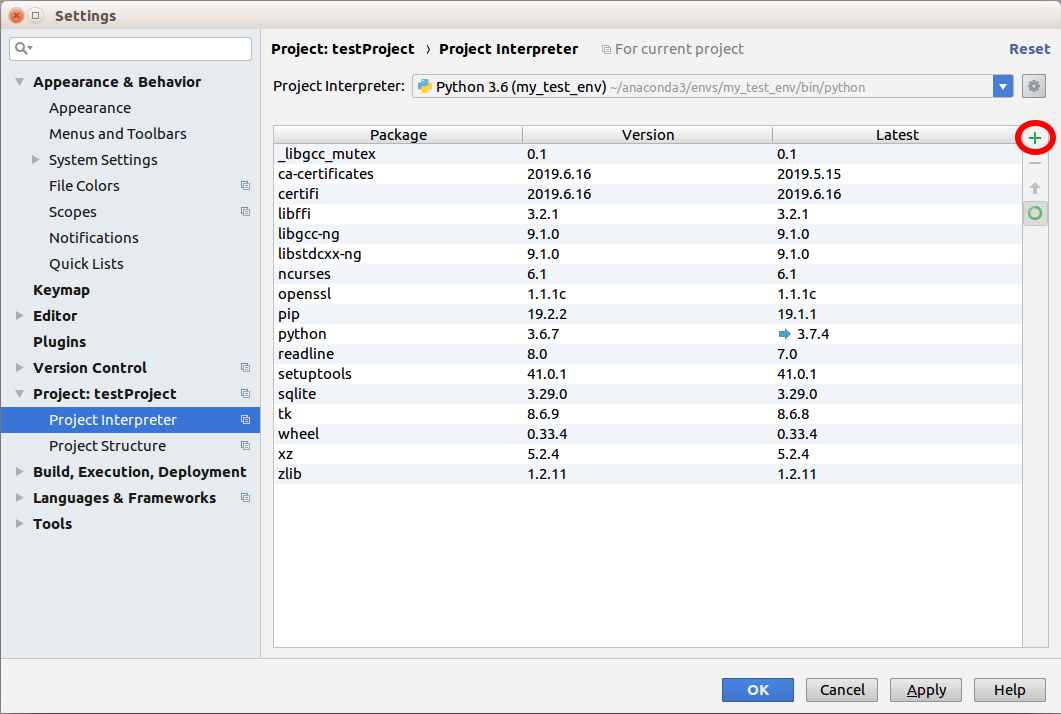 Let's discuss how to install libraries to this conda environment. We have two ways to do this. The first one is that activating the conda environment in command line(using the command conda activate <your_env_name>) and install relevant libraries using conda install command. For example conda install numpy. The second one is that installing libraries using PyCharm. For that navigate to the File -> Settings and open the Settings window. Then navigate to the Project: testProject -> Project Interpreter and click on the plus mark.