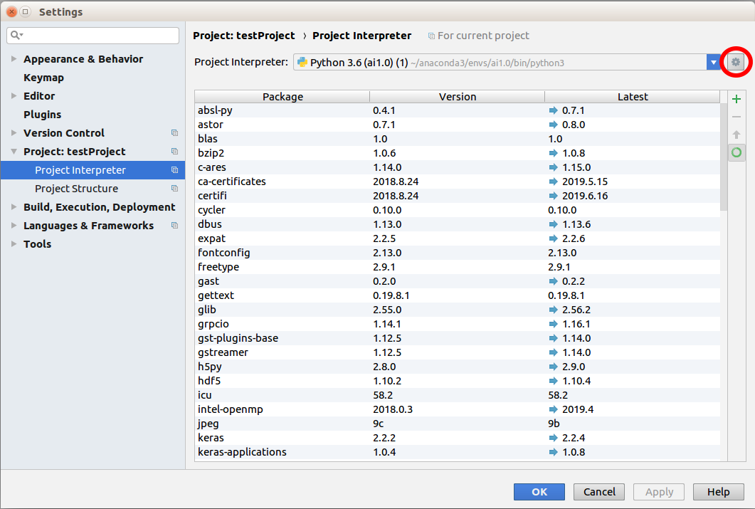 In the Settings window, navigate to Project: testProject -> Project Interpreter and click on the wheel icons and click on the Add.... Now you will be able to see the Add Python Interpreter window.