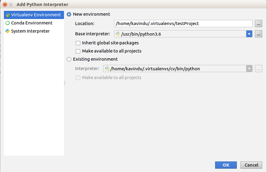 conda create --name my_test_env python=3.6Open PyCharm and create the project that you need to continue with your coding. For that you can go to File -> New Project..., in my case I have created the project called testProject.