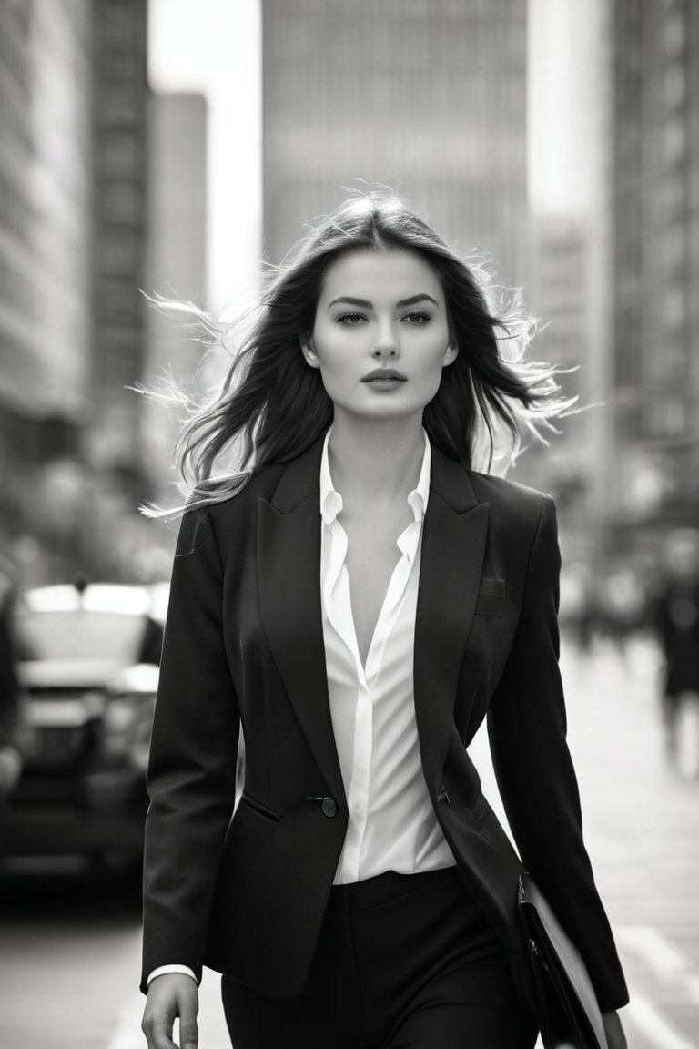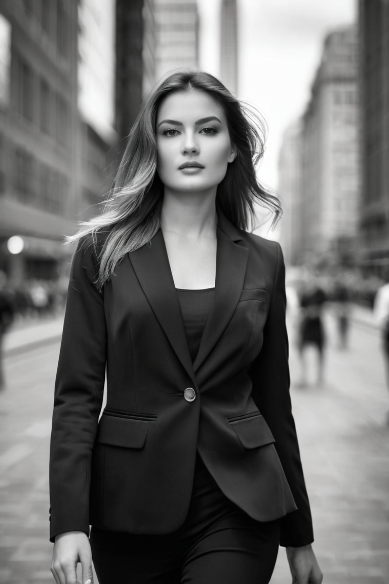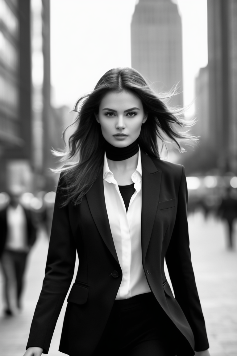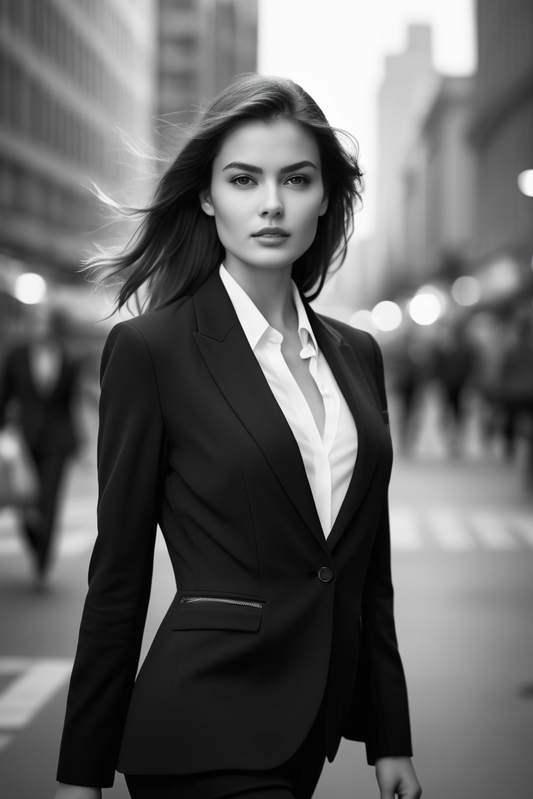 An artistic black-and-white photograph of a sophisticated young woman in a city setting, walking confidently amidst a blurred, bustling urban background. She has a serious expression, with sharp facial features and intense eyes that convey strength and elegance. She wears a tailored black blazer that emphasizes her poised and fashionable look. Her hair flows naturally, catching a bit of the wind, and soft natural lighting highlights her face against the slightly out-of-focus crowd and tall city buildings. The scene is atmospheric, evoking a sense of timeless class and urban sophistication.