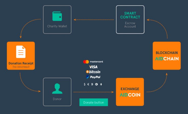 AIDChain, bağışçıların bağışlarını ve kimliklerini doğrulamak, bununla birlikte iletişimi yönetmek için hayır kurumlarını izlemelerine izin veren bir blok zinciri. AIDChain yardım kuruluşu bankasının API entegrasyonu ile hem chain, hem de off-chain işlemleri takip edebiliyor. AidChain, bağışlarla ilgili tüm verileri gösterecek ve her bağış sonrası nihai kanıt olarak saklanabilecek bir makbuz sağlayarak, blockchain üzerinde tutacak. Makbuz içeriği: bağış miktarı ve zaman damgası olacak.