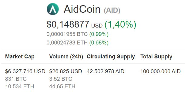 Aidcoin, Ethereum blockchaini üzerinde çalışan, şeffaf bir şekilde bağış yapabilmek ve AIDChain platformu tarafından sağlanan hizmet ekosistemine erişim için kullanılacak bir token. $AID