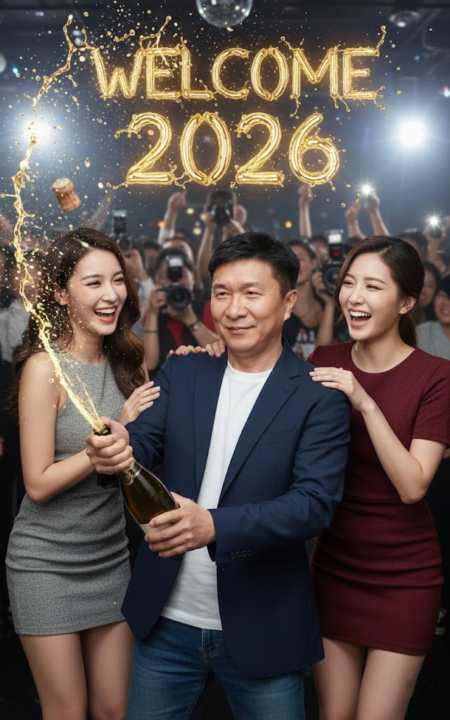 Subjek membuka botol sampanye agak menyamping. Semprotan sampanye kuning membeku di udara (masih terlihat gabus tutup botol yang ikut terdorong di udara), cairan sampanye membentuk tulisan kuning “WELCOME 2026” diatas botol.