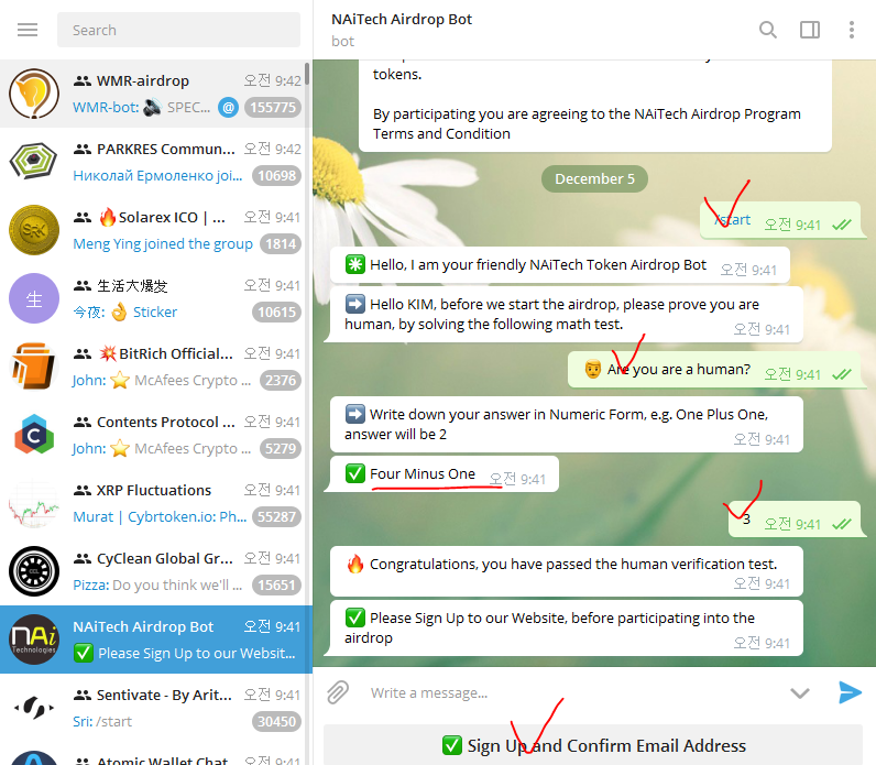 - 텔레그램으로 돌아와 이메일 입력 (+ 1 token worth $1.3)
