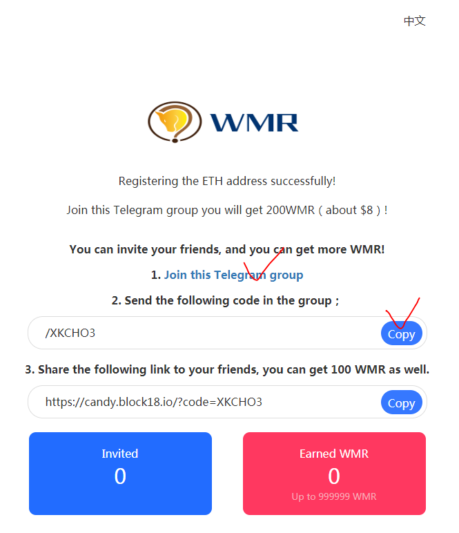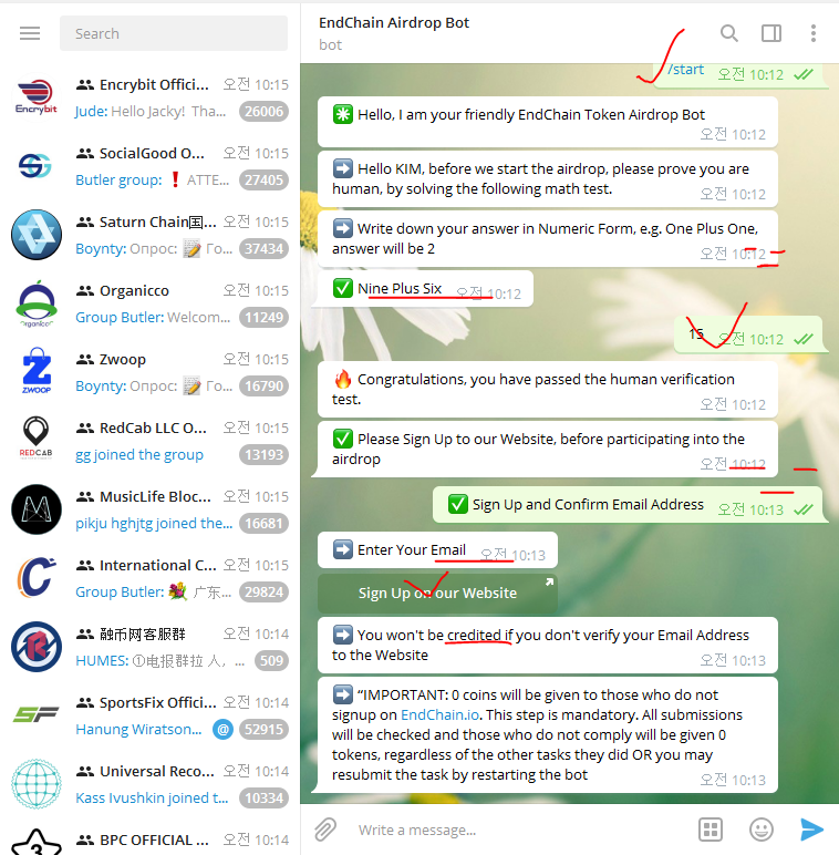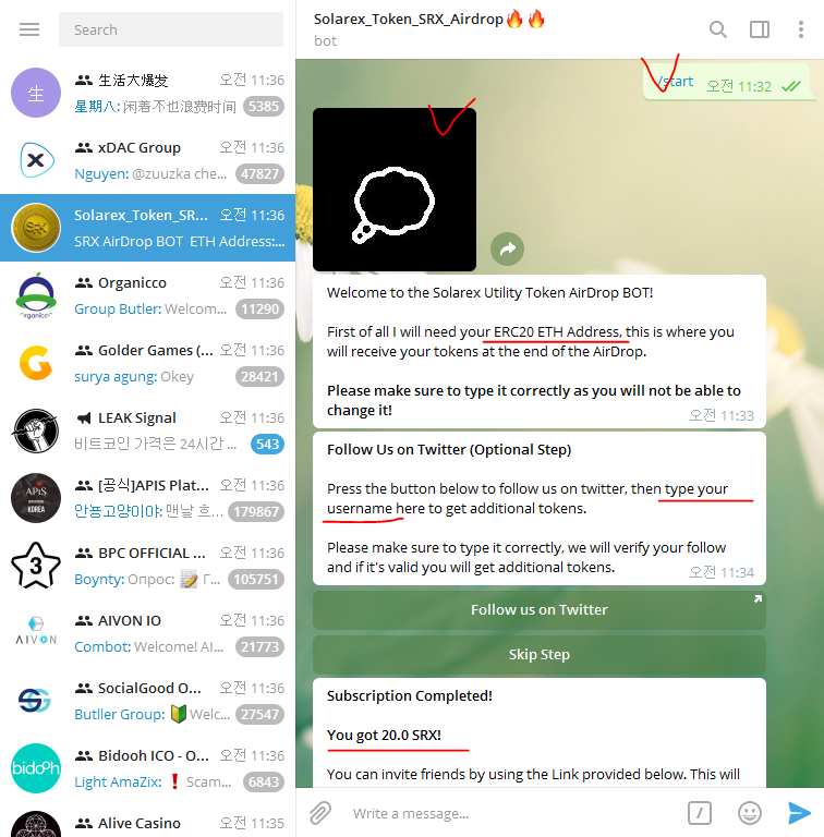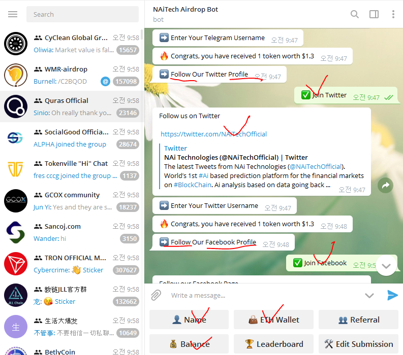 - 텔레그램 조인 및 아이디 입력 @ 포함 (+ 1 token worth $1.3)