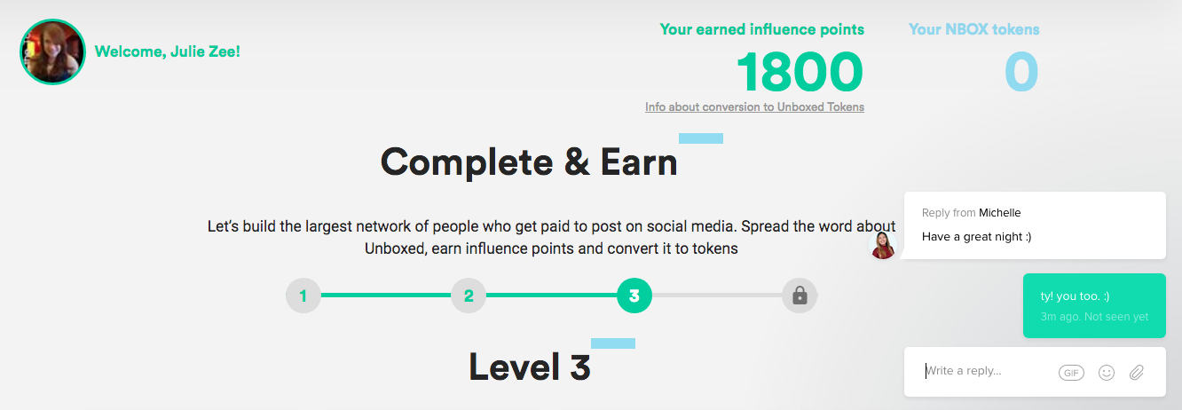 I have completed my tasks and earned enough point to receive 250 tokens. This only took me one evening. I asked customer service when the points will be converted to tokens, they are on an instant chat line and were able to help me very quickly and efficiently. The answer is right after the ICO they will be converted automatically.