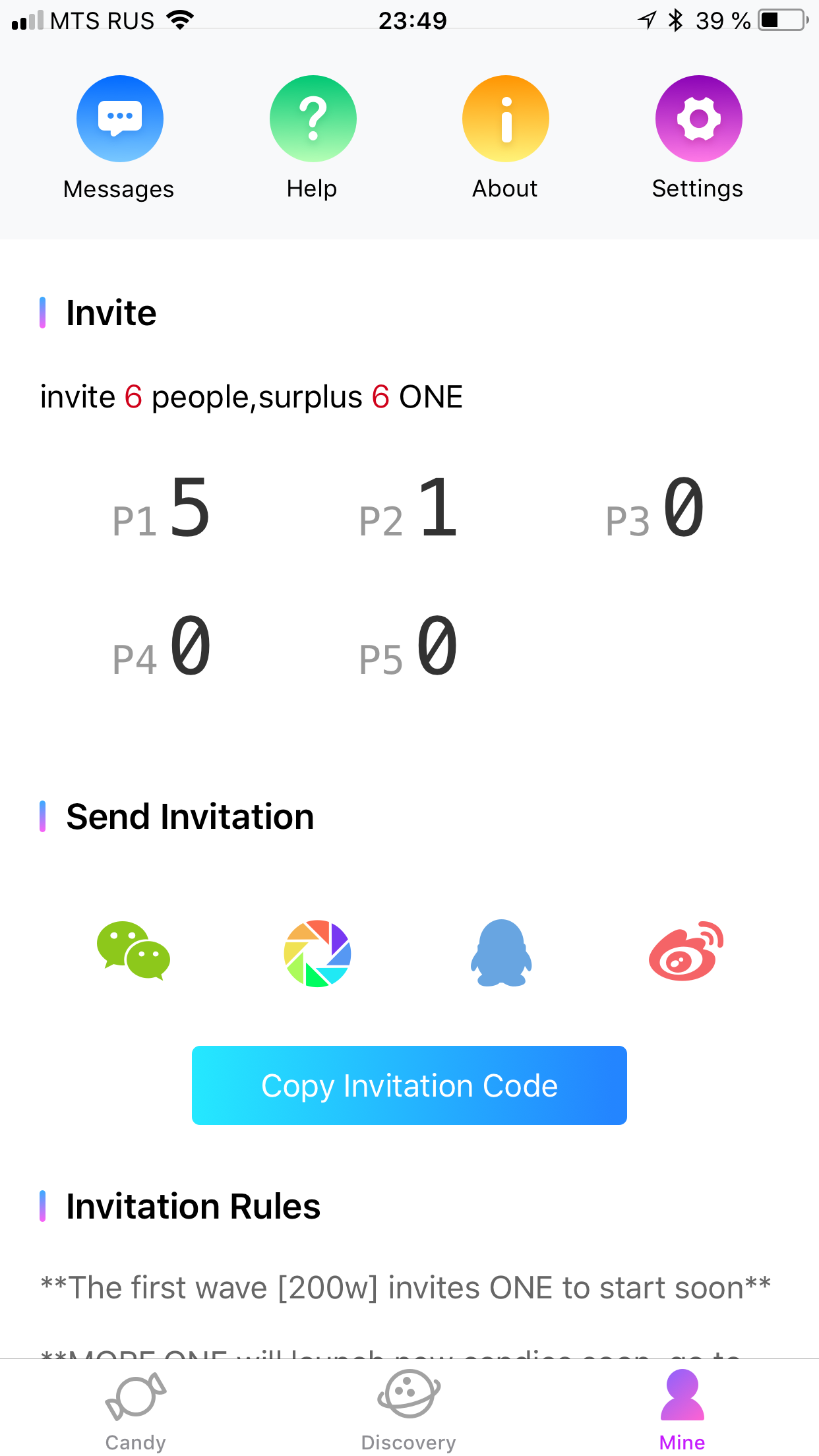 An important feature of the app is the invitation system which has 5 levels. Everyone who installs the app on your invitation code will bring you 1 ONE. Everyone invited by your friend will bring 1 ONE to him and 1 ONE to you and so 5 steps!