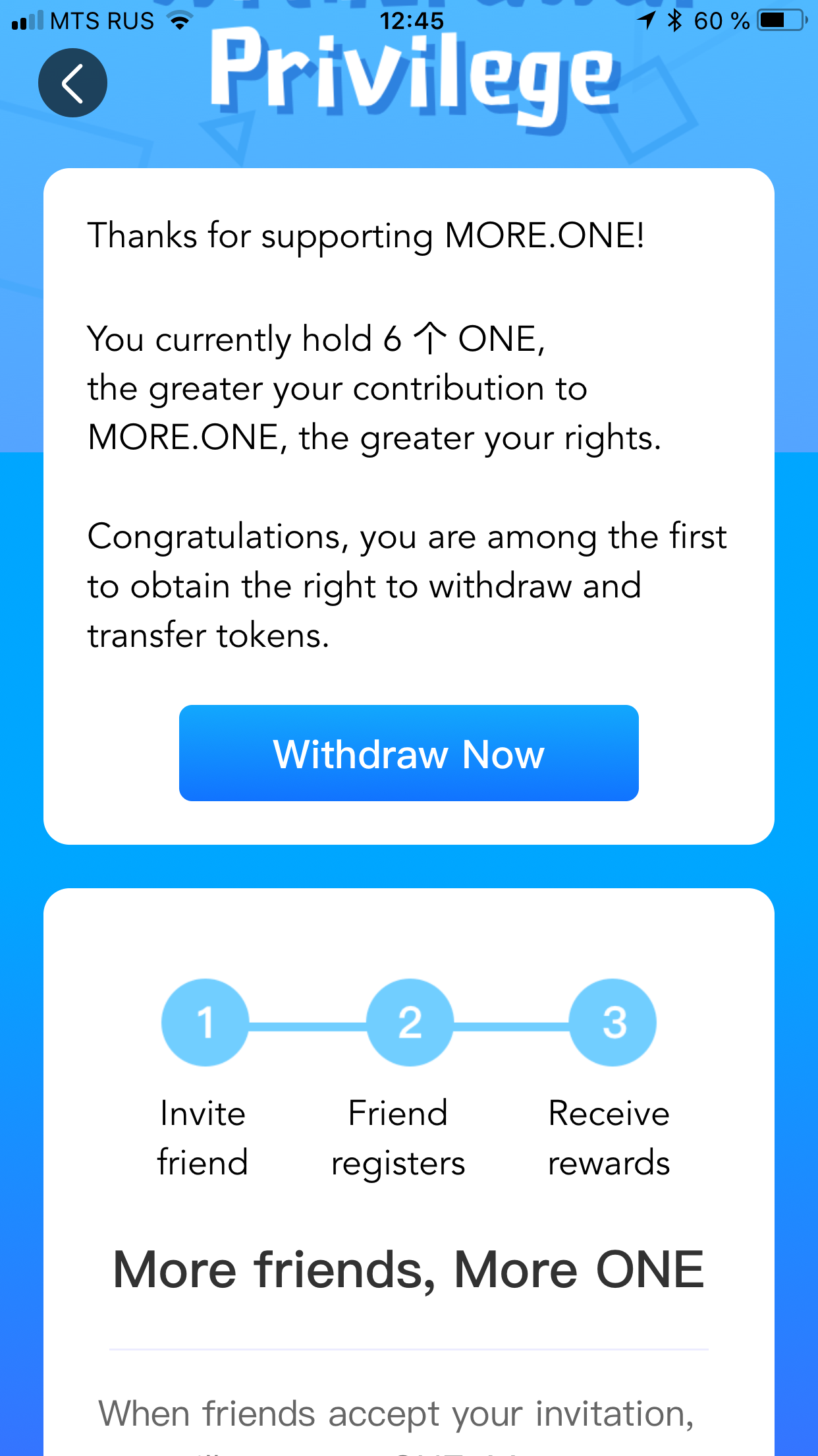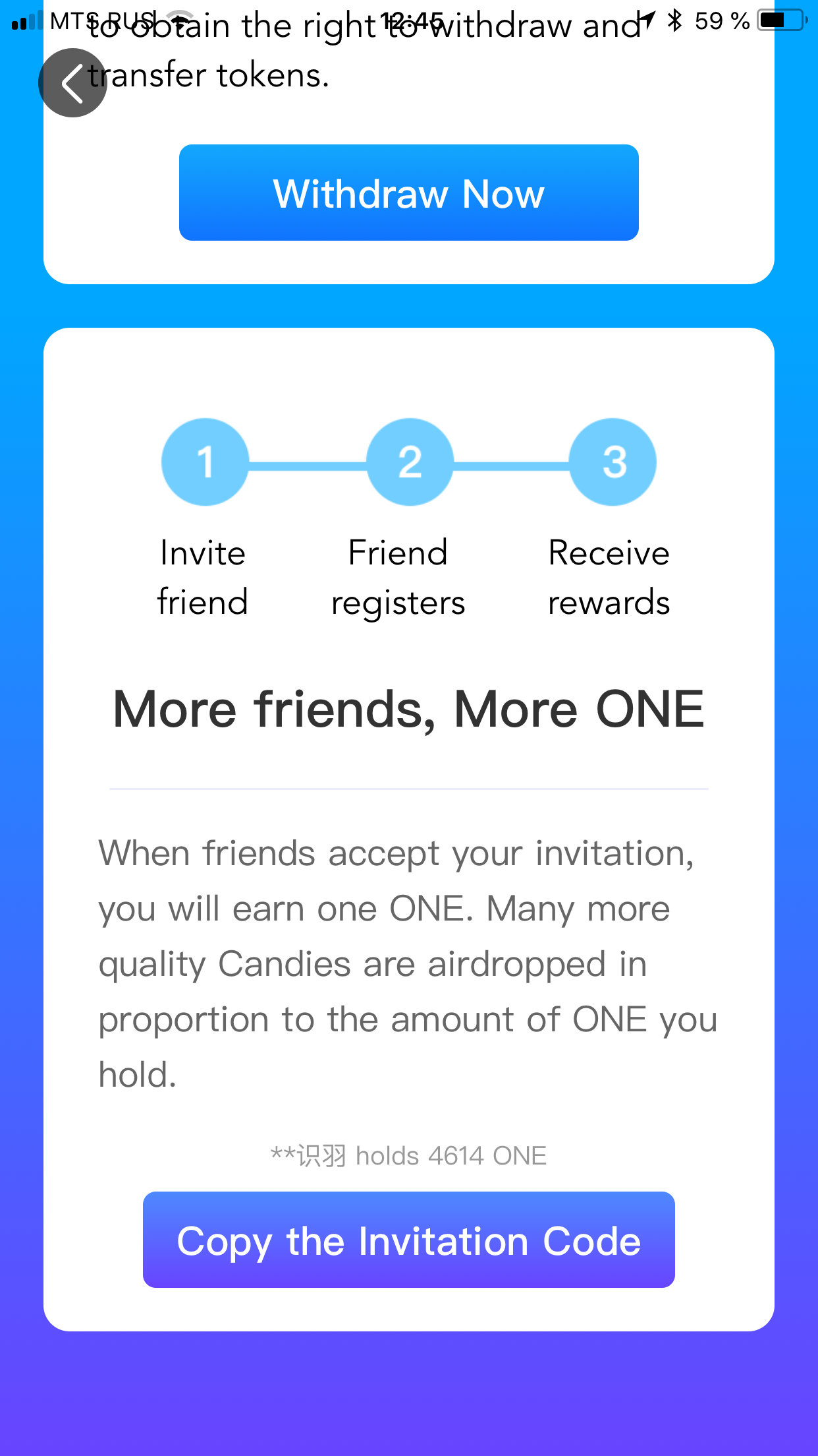It is also important to know that in order to withdraw coins in the future you will need to have at least 1 ONE on your account. This means that you must invite at least one friend and he must install the app and register!