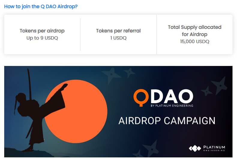 Q DAO Airdrop is worth up to 9 USDQ tokens (~$ 9). Share your referral link to earn 1 USDQ token (~$ 1) for every referral, the referred friend will also earn 1 USDQ token (~$ 1).
