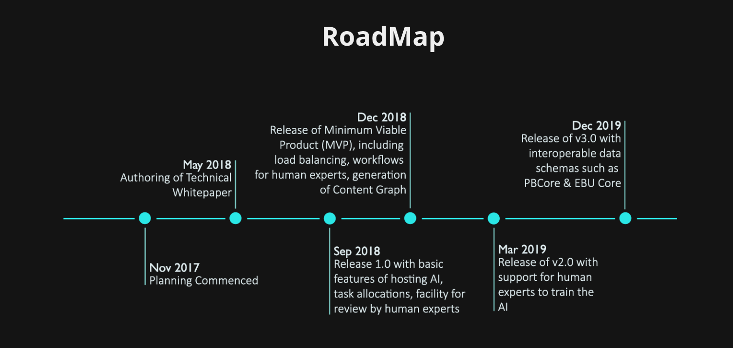 • AI: The trained AI algorithms will be deployed on the mining nodes, so miners (GPU-CPUs) can be used to scan media files, create advanced metadata, including classification, categories, transcripts, time-coded tags.