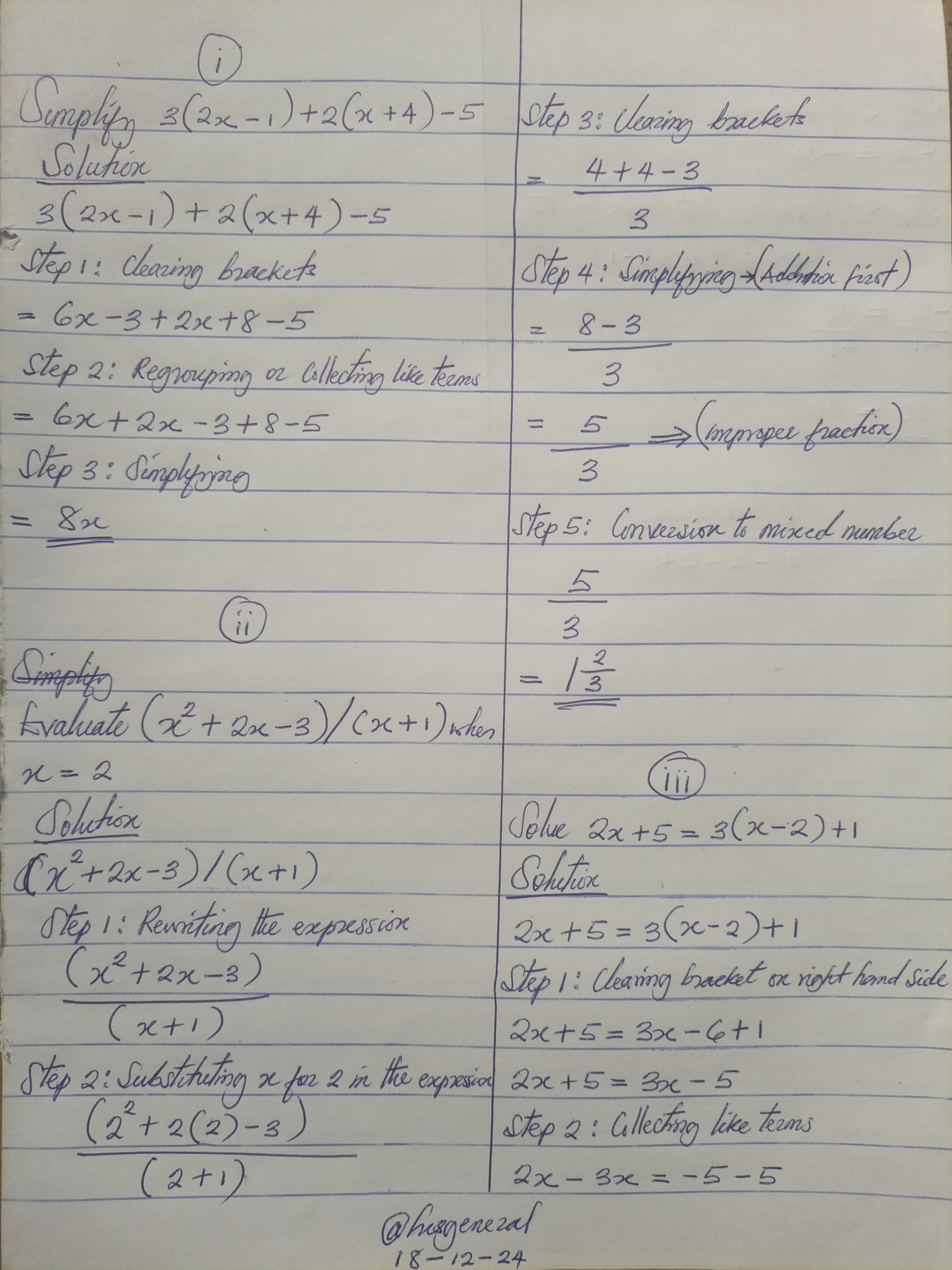 • iii. Solve the following equation: 2x + 5 = 3(x - 2) + 1