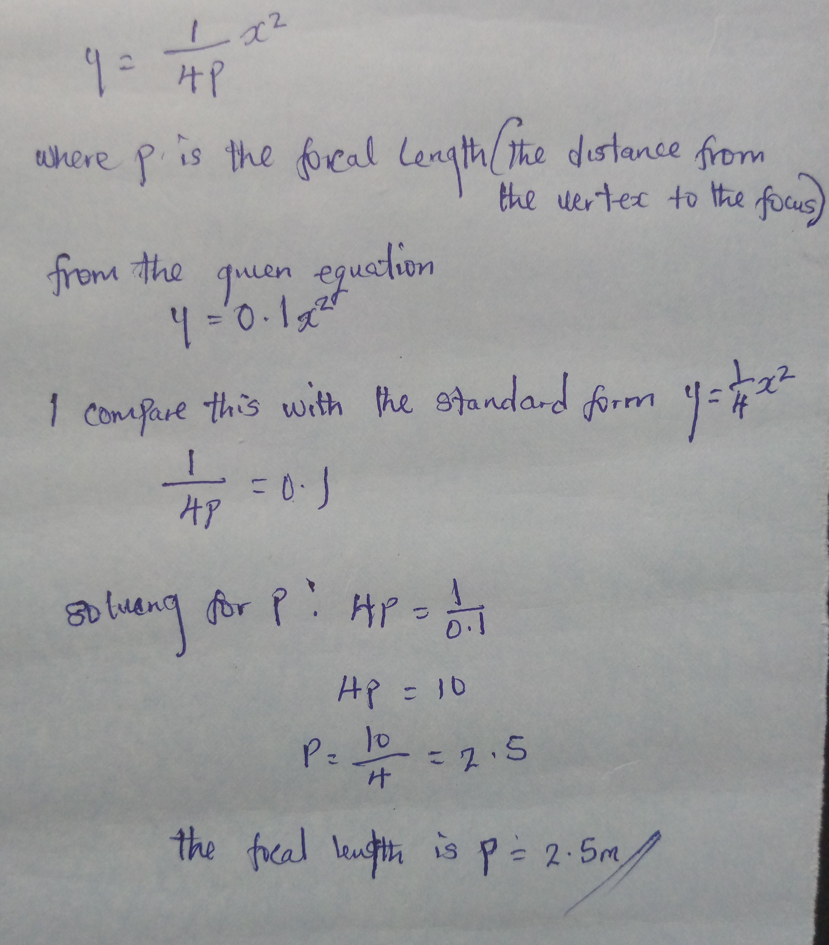 Suppose there's a satellite dish which is shaped like paraboloid.If equation of the paraboloid is given by y = 0.1x^2 then here x and y are measured in meters so now;