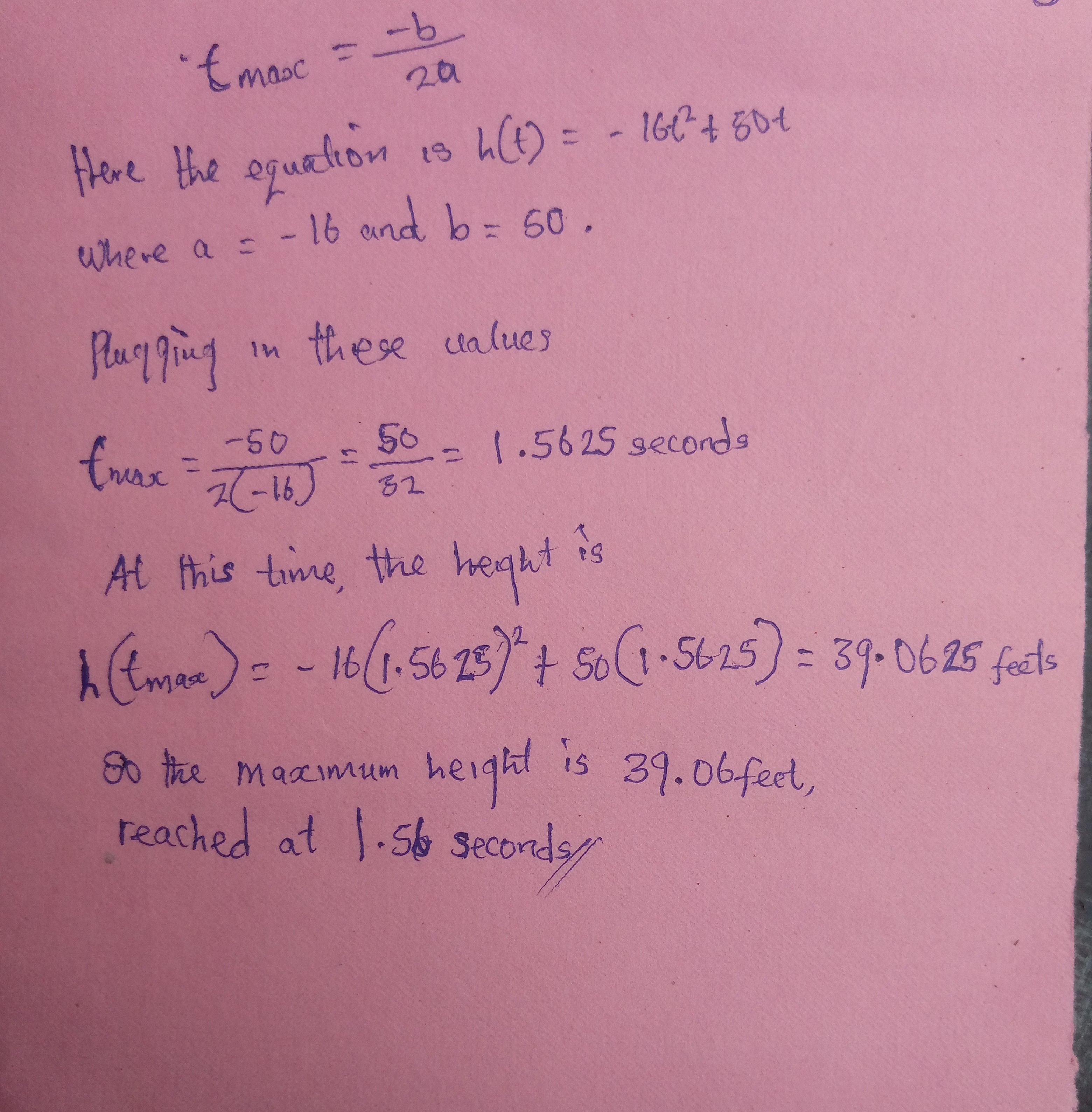 To find the maximum height I calculate the vertex of the parabola, the formula for the time at which the vertex occur is as show in my calculation below