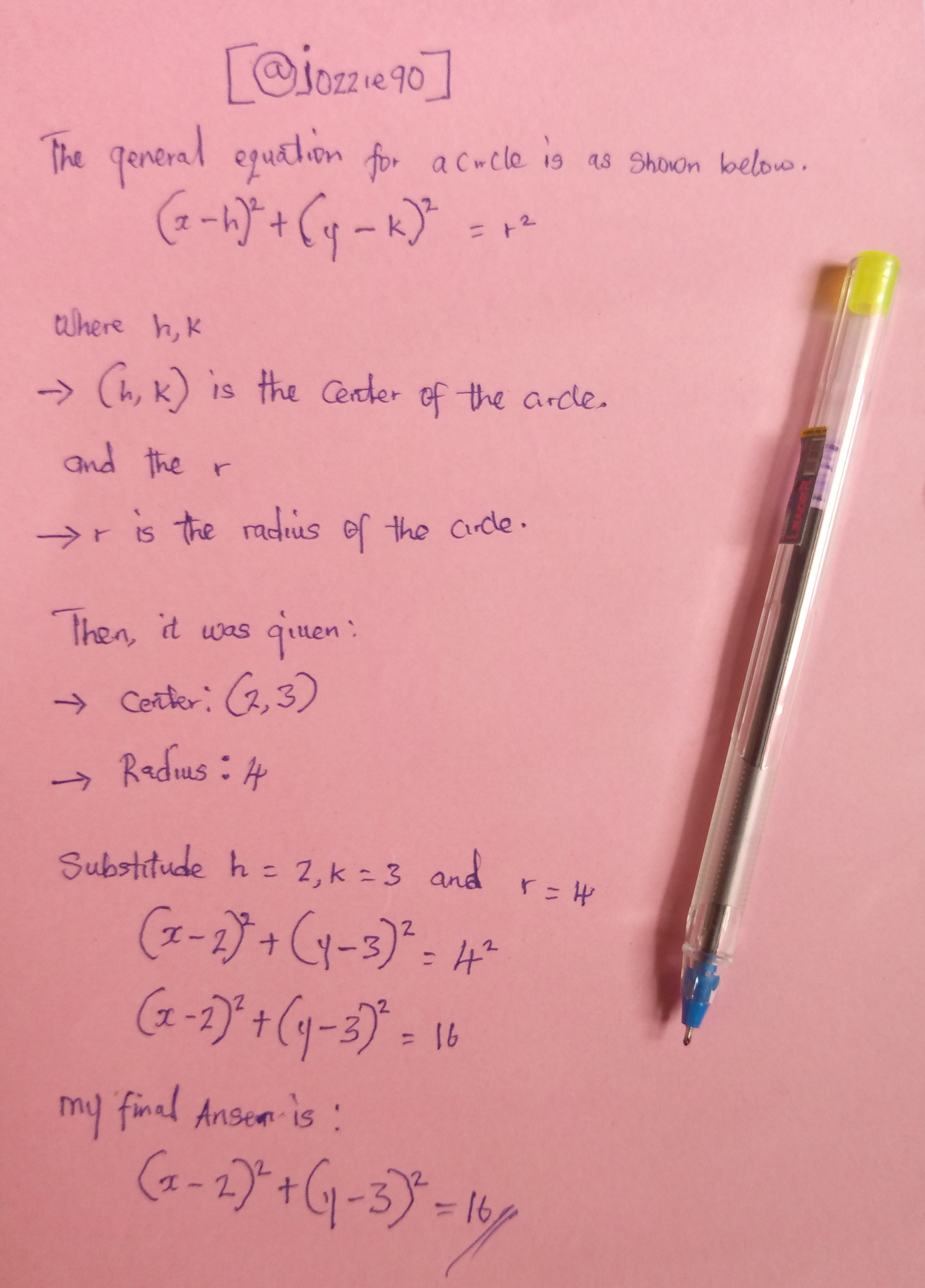 Please find out equation of the circle with center (2, 3) and radius 4.