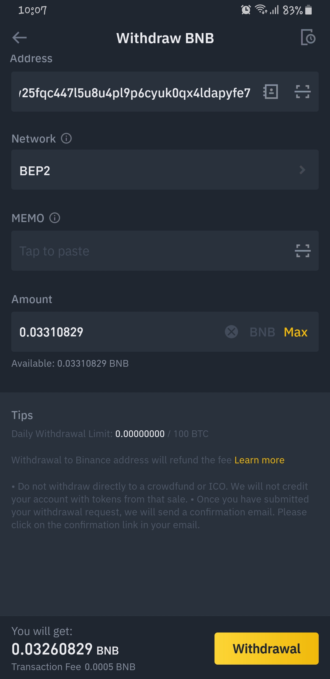 here, i am asked to fill in the parameters of how much BNB i want to withdraw, and of course my BNB wallet address on the trust wallet app