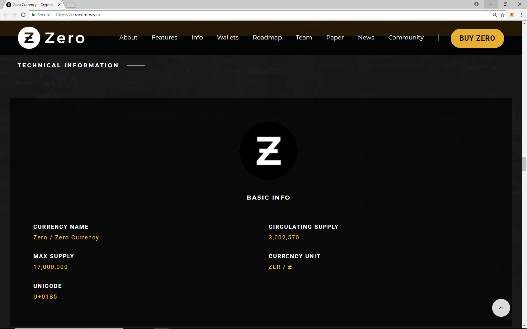 I few days ago I stumbled upon a coin called Zero Currency. The coin reached an all time of high of around $12.00 back during the bull-run earlier this year and currently trades around $0.26 at the time of this post. Zero is currently ranked #903 on Coinmarketcap, with a meager market-cap of only $775,000 and a circulating supply of 3,002,500 $ZER.