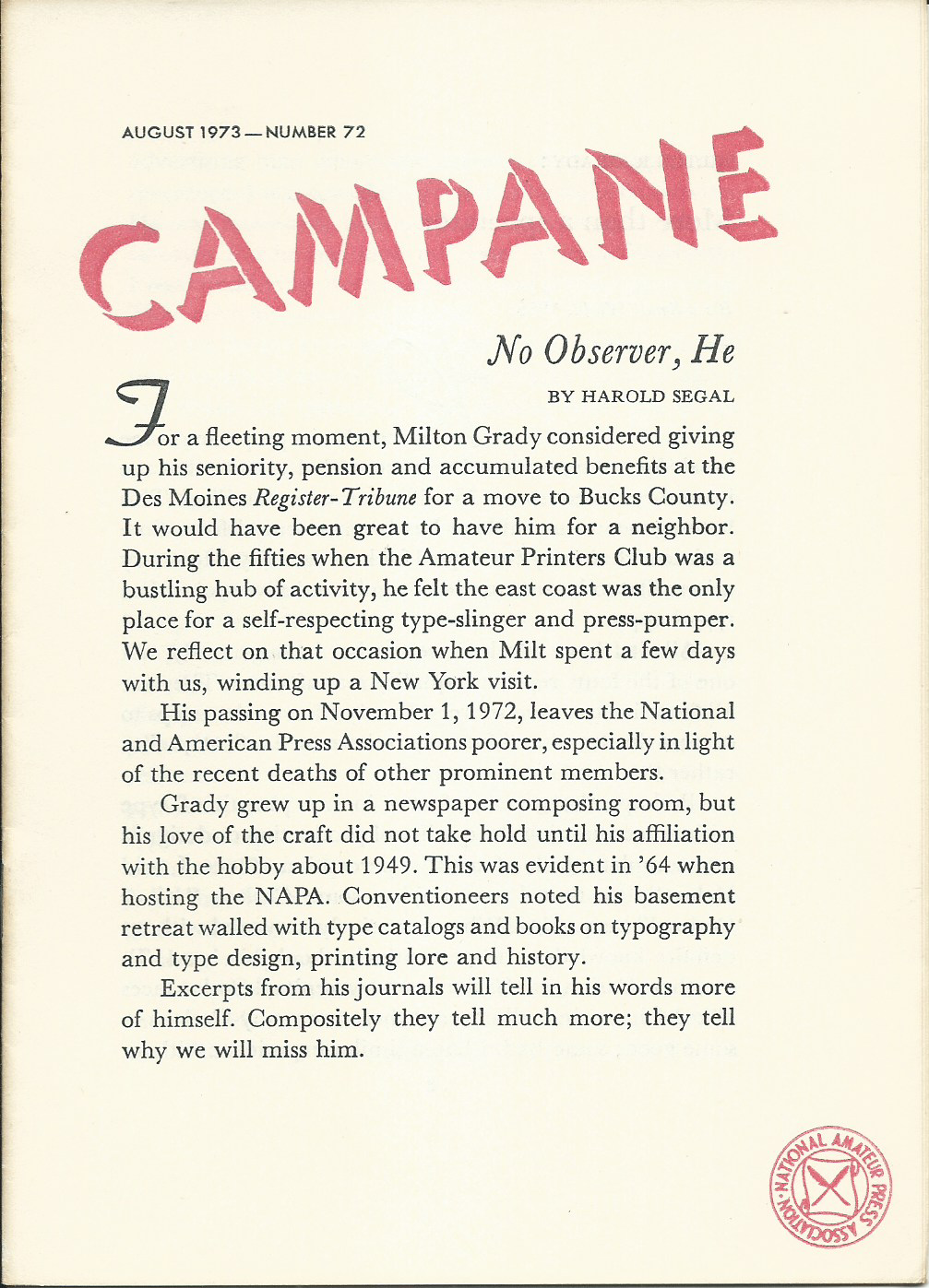 Campane - Number 72, August 1973jakesjournals (32)in #amateurjournalism • 6 years ago In the 72nd Campane, Harold Segal celebrates the life and work of amateur printer Milton R. Grady. https://jakesjournals.com/campane-72/ #hobbyprinter #caslon #baskerville #typesetter #letterpress #editing #printing