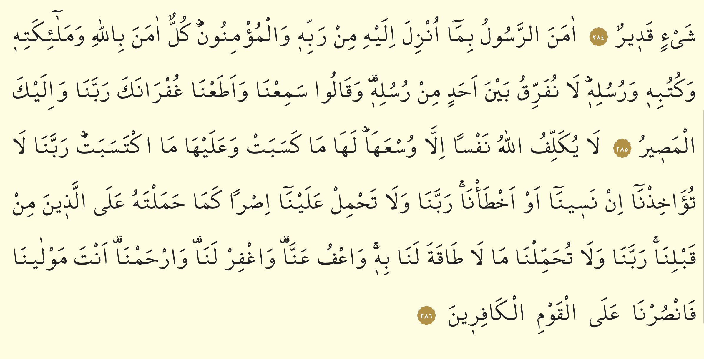 ﴾285﴿ Allah bir kimseyi ancak gücünün yettiği şeyle yükümlü kılar. Onun kazandığı iyilik kendi yararına, kötülük de kendi zararınadır. (Şöyle diyerek dua ediniz): "Ey Rabbimiz! Unutur, ya da yanılırsak bizi sorumlu tutma! Ey Rabbimiz! Bize, bizden öncekilere yüklediğin gibi ağır yük yükleme. Ey Rabbimiz! Bize gücümüzün yetmediği şeyleri yükleme! Bizi affet, bizi bağışla, bize acı! Sen bizim Mevlâmızsın. Kâfirler topluluğuna karşı bize yardım et." ﴾286﴿