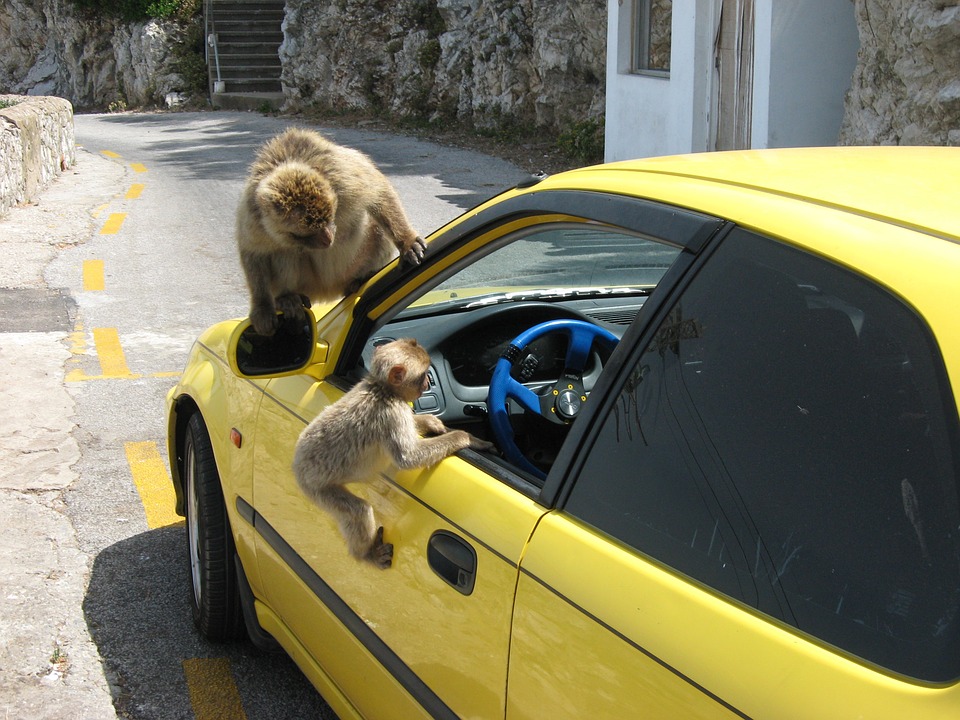 All of a sudden the car stopped and the monkeys started jumping of the car and pushing it forward.