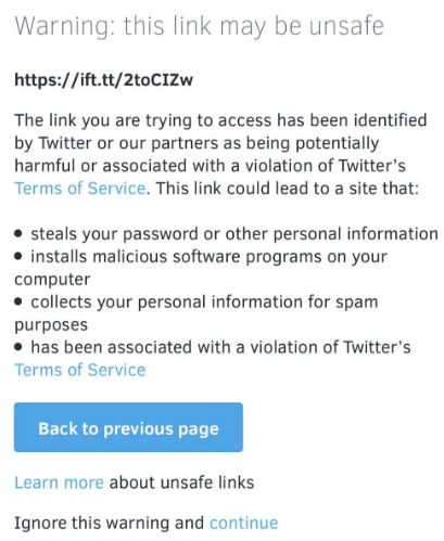 The guy who told me the article was being suppressed sent me a screenshot, and it detailed that Twitter is trying to scare people away from clicking on my links, as they "may be unsafe".