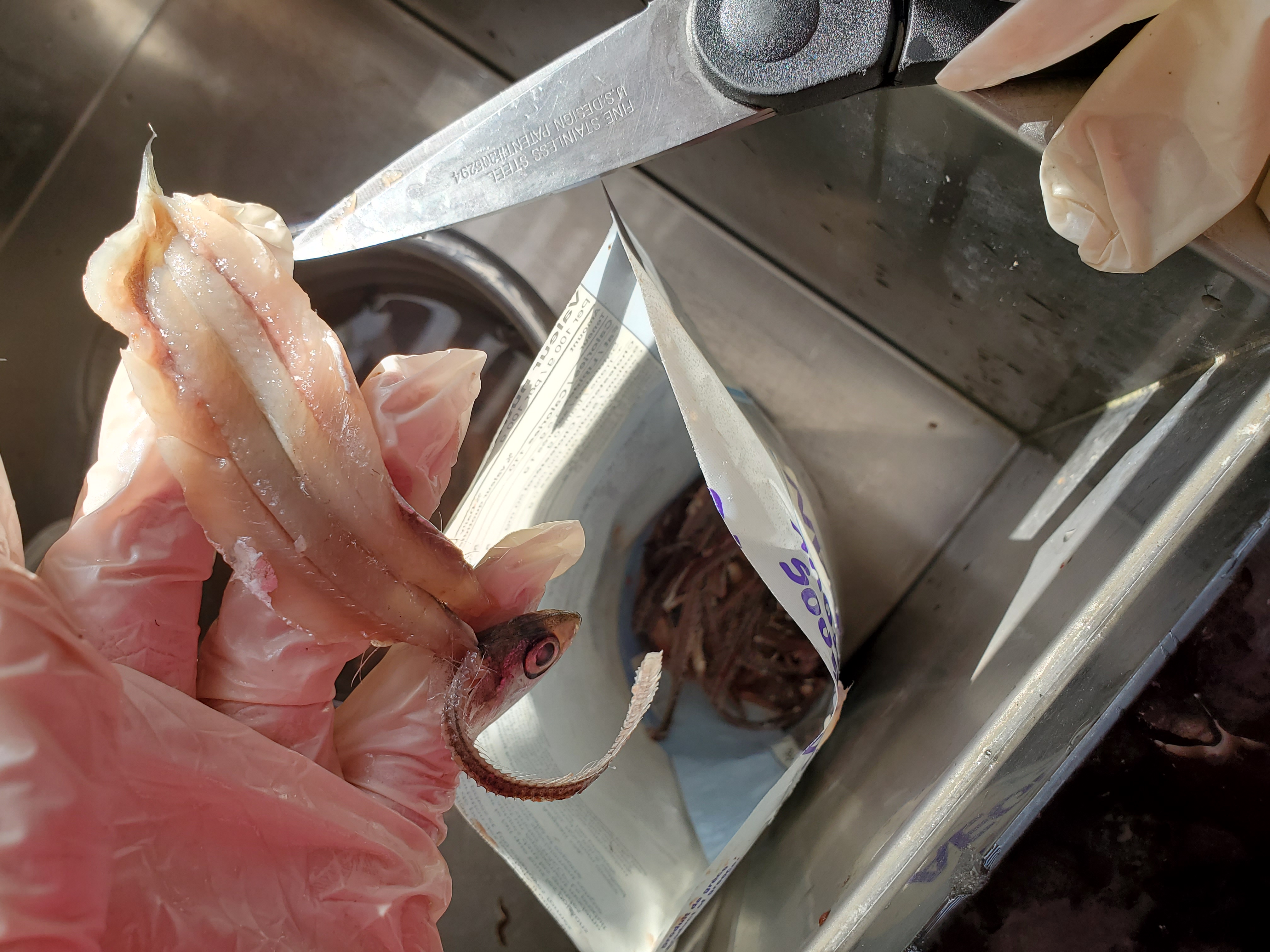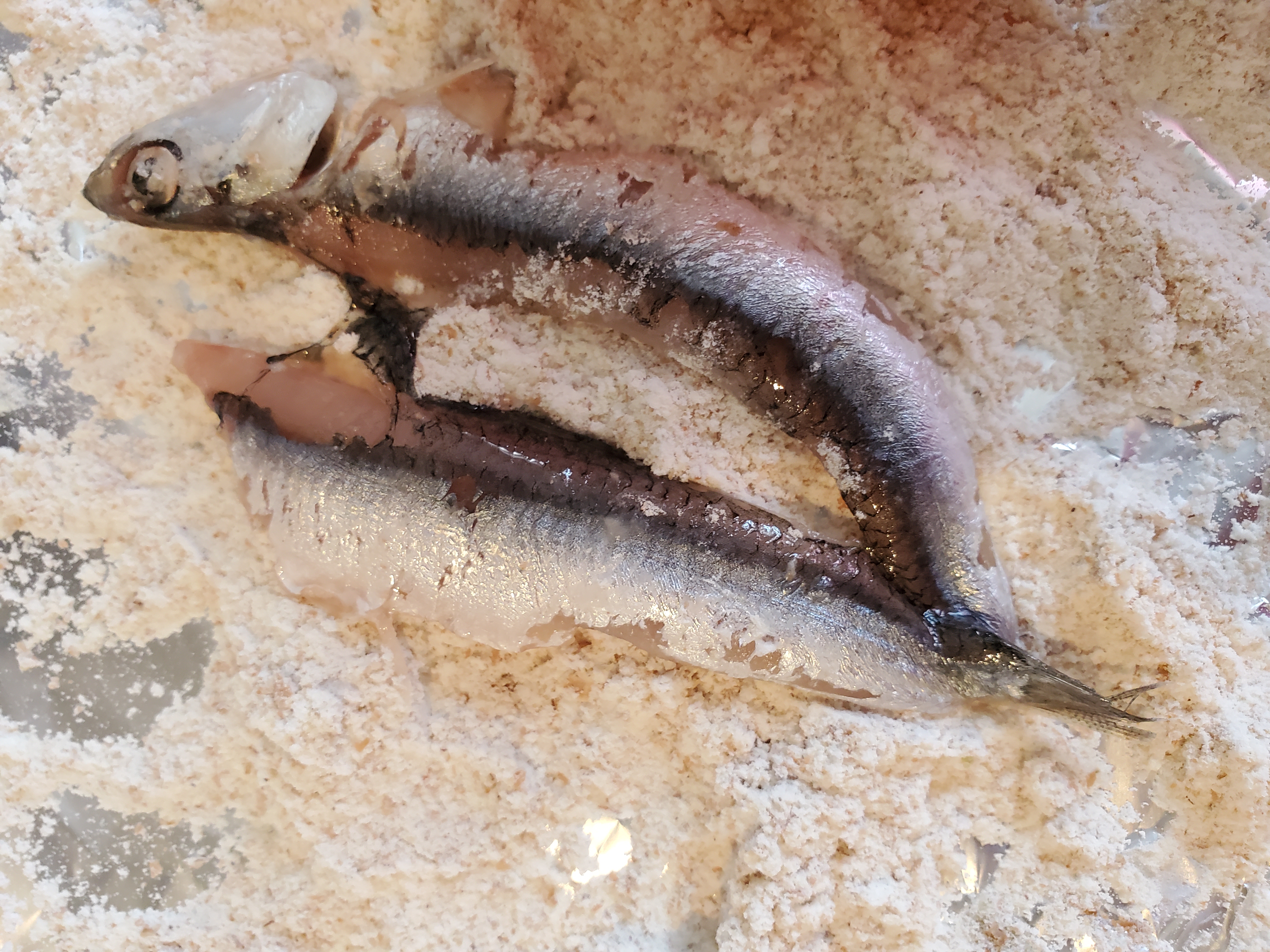 With use of scissors,I degut it and remove the bones.Then I cover it in breadcrumbs.
