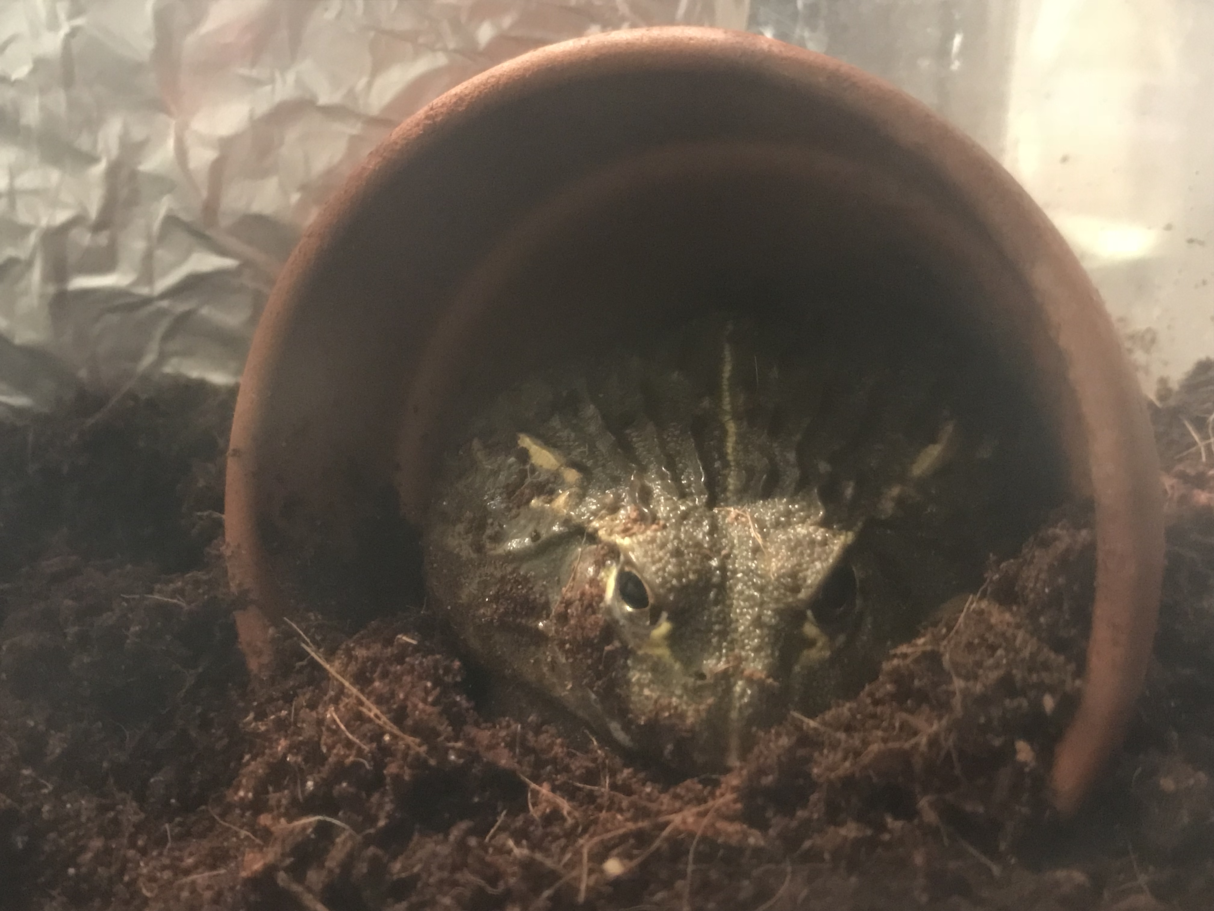 Fat Frog in a Potjsquirms (52)in #animalphotography • 8 years ago Peter the giant african bullfrog is so tubby that he barely fits in his hiding pot. Dig him out of his burrow and took him out of his tank today to clean it, and when I put him back in he went to hide in the pot. He barely fits now. #animals #pets #frog #nature