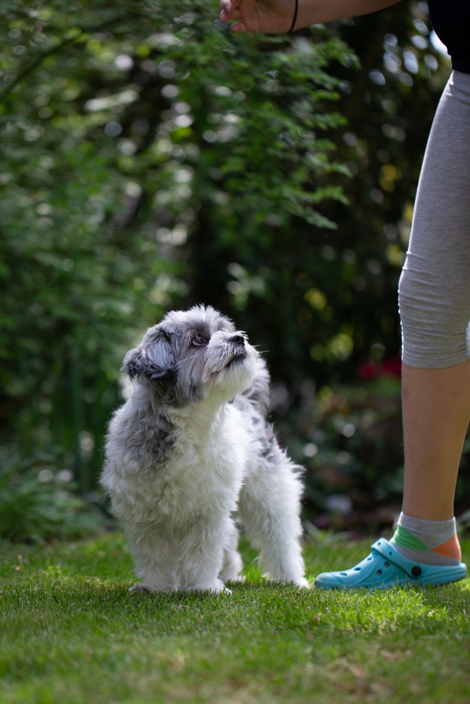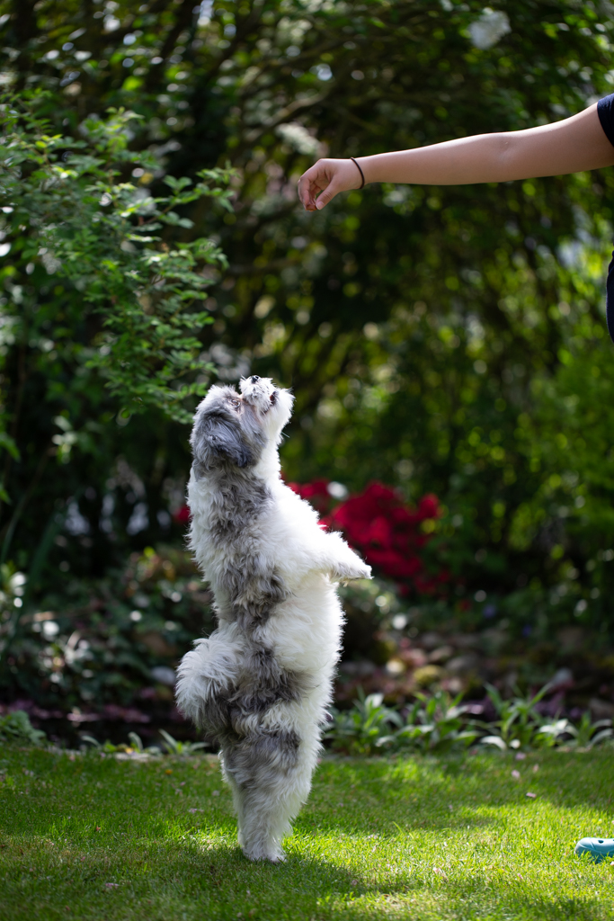 The Havanese is small in size and sturdy in structure with a tail carried over its back and ears that drop and fold.