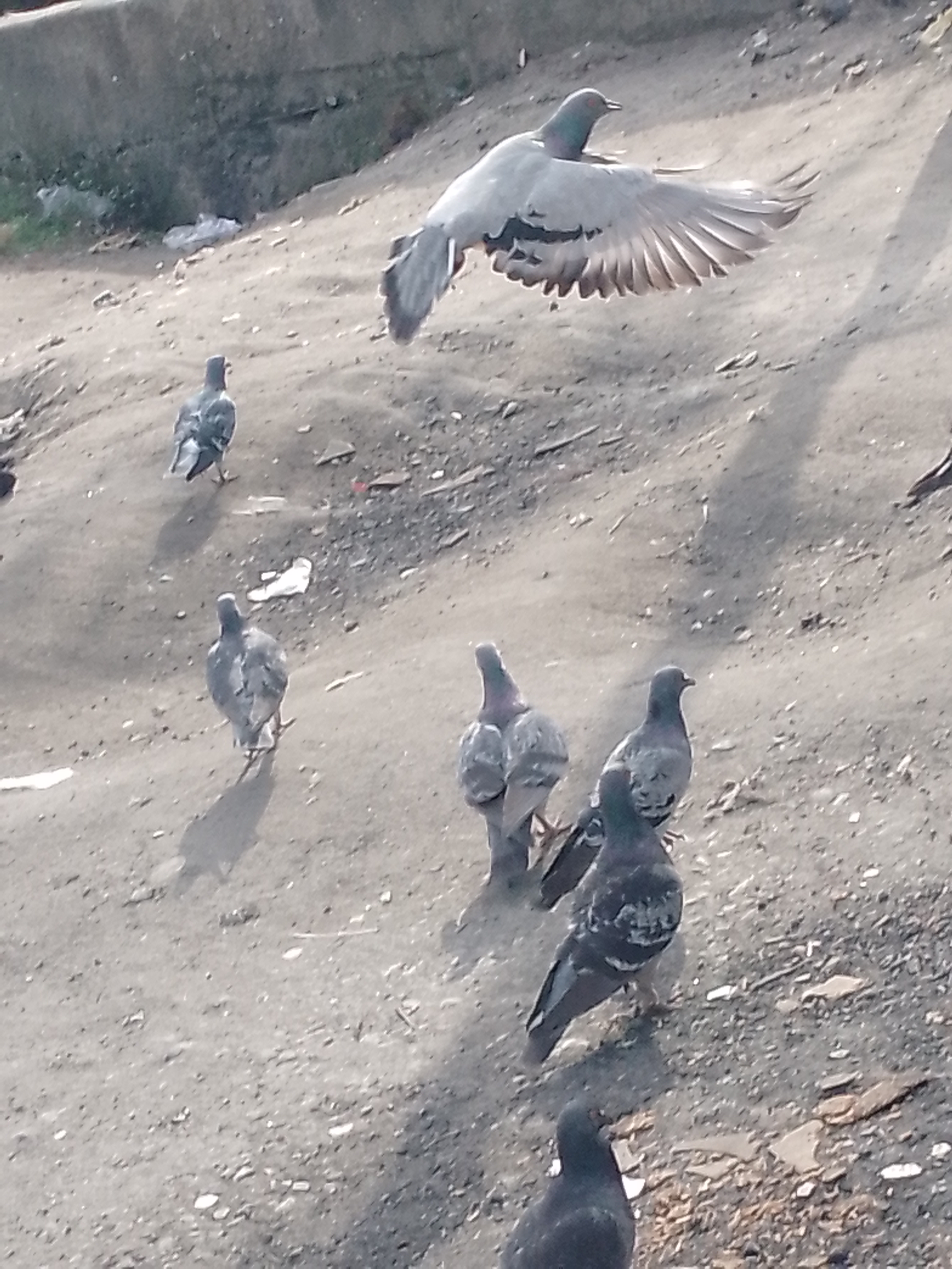 Yesterday was Tuesday. I went to pick my children up from school, and on our way back, we had quite an adventure, so to speak. My son, full of excitement, suggested I take pictures of the animals we met along the road. First, we came across a gathering of pigeons scattered across the ground, pecking at grains and moving restlessly as though in a meeting....