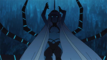 Sin embargo, después de esto no se menciona nada al respecto, no se toma en cuenta, ni sobre algún tema interesante, sino hasta el capítulo 13, en donde se comienza a mostrar el pasado de Zero Two. A partir de aquí es donde la historia se comienza a tornar más atractiva; se revela el pasado de algunos personajes, se añaden nuevos sujetos que generan intriga. Es el punto en donde pensamos que algo bueno puede surgir de todo esto. Descubrimos que los Klaxosaurios tienen un líder, la Princesa Klaxosaurio, como le denomina el consejo de gobierno liderado por “Papá”, de apariencia humanoide pero con cuernos y tentáculos, quien vive en las profundidades de la Tierra, y es conocida por el consejo por alguna razón.
