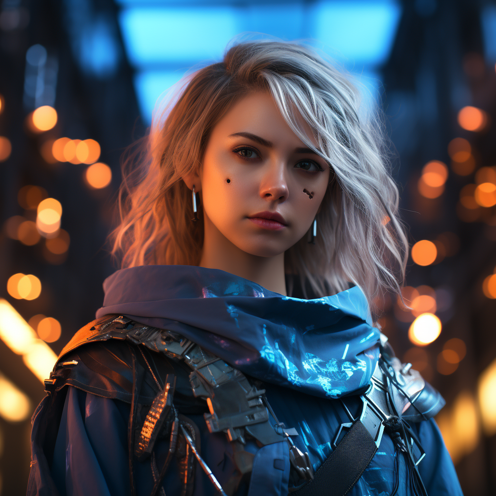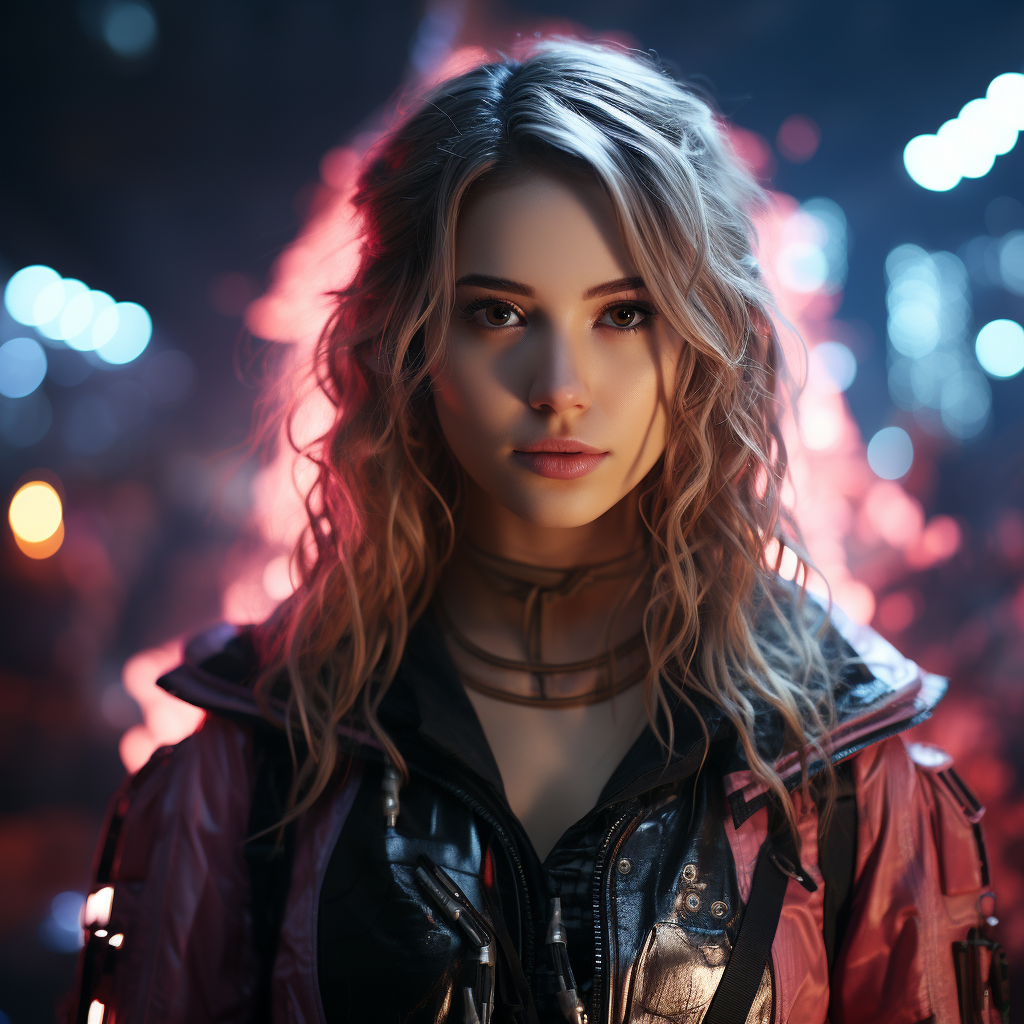 An anime girl in a futuristic cyberpunk cityscape, wearing high-tech attire and holding a glowing energy sword. (Sleek, futuristic, powerful, cyberpunk, urban, dynamic, technologically advanced), Digital medium format camera, Telephoto lens, Nighttime, Neon and vibrant colors, N/A (digital)